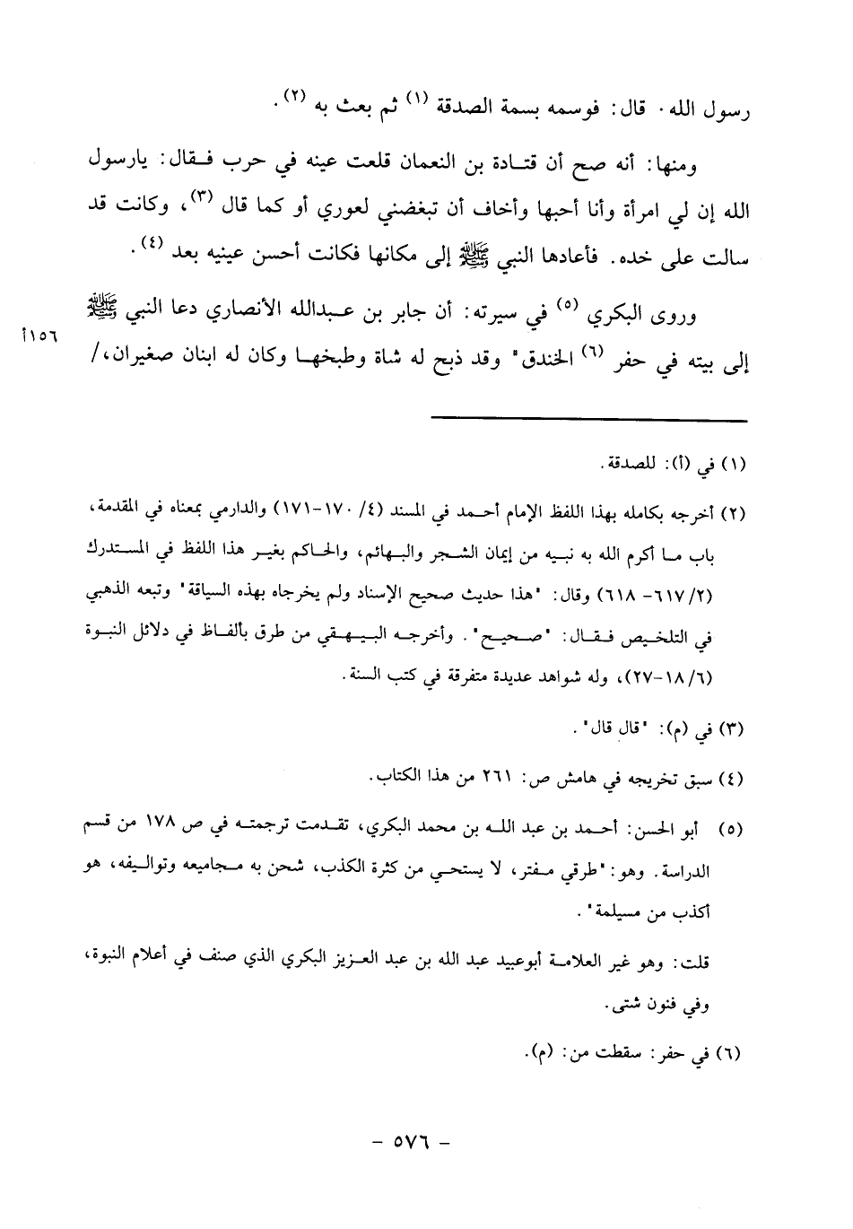 وروى البكري «5» في سيرته: أن جابر بن عبد الله الأنصاري دعا النبي صلى الله عليه وسلم إلى بيته في حفر «6» الخندق" وقد ذبح له شاة وطبخها وكان له ابنان صغيران،/