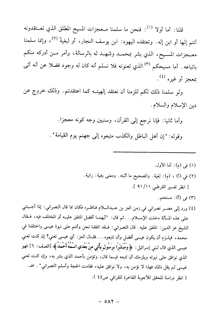 قلنا: أما أولا «1»: فنحن ما سلمنا معجزات المسيح المطلق الذي تعتقدونه أنتم إلها أو ابن إله. وتعتقده اليهود: ابن يوسف النجار، أو لبغيّة «2»، وإنما سلمنا معجزات المسيح، الذي بشر بمحمد وشهد له بالرسالة، وأمر من أدركه منكم باتباعه. أما مسيحكم «3» الذي تعنونه فلا نسلم أنه كان له وجود فضلا عن أنه أتى بمعجز أو غيره «4».