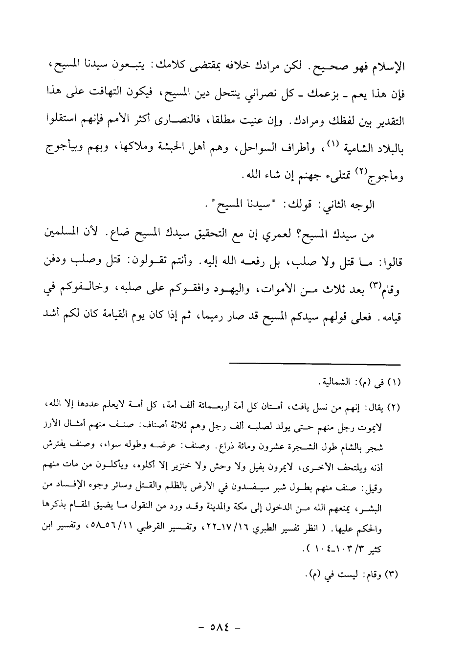 الإسلام فهو صحيح. لكن مرادك خلافه بمقتضى كلامك: يتبعون سيدنا المسيح، فإن هذا يعم- بزعمك- كل نصراني ينتحل دين المسيح، فيكون التهافت على هذا التقدير بين لفظك ومرادك. وإن عنيت مطلقا، فالنصارى أكثر الأمم فإنهم استقلوا بالبلاد الشامية «1»، وأطراف السواحل، وهم أهل الحبشة وملاكها، وبهم وبيأجوج ومأجوج «2» تمتلئ جهنم إن شاء الله.