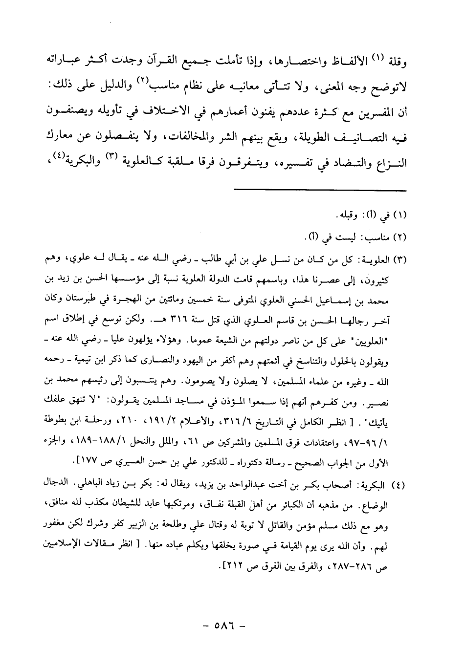 أن المفسرين مع كثرة عددهم يفنون أعمارهم في الاختلاف في تأويله ويصنفون فيه التصانيف الطويلة، ويقع بينهم الشر والمخالفات، ولا ينفصلون عن معارك النزاع والتضاد في تفسيره، ويتفرقون فرقا ملقبة كالعلوية «3» والبكرية «4»،
