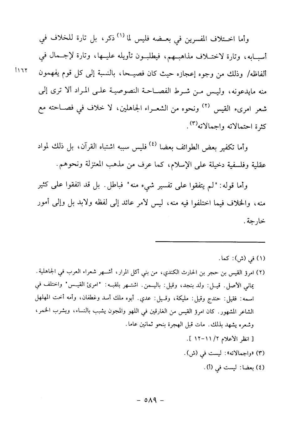 وأما اختلاف المفسرين في بعضه فليس لما «1» ذكر، بل تارة للخلاف في أسبابه، وتارة لاختلاف مذاهبهم، فيطلبون تأويله عليها، وتارة لإجمال في ألفاظه/ وذلك من وجوه إعجازه حيث كان فصيحا، بالنسبة إلى كل قوم يفهمون منه ما يدعونه، وليس من شرط الفصاحة النصوصية على المراد ألا ترى إلى شعر امرئ القيس «2» ونحوه من الشعراء الجاهلين، لا خلاف في فصاحته مع كثرة احتمالاته واجمالاته «3».