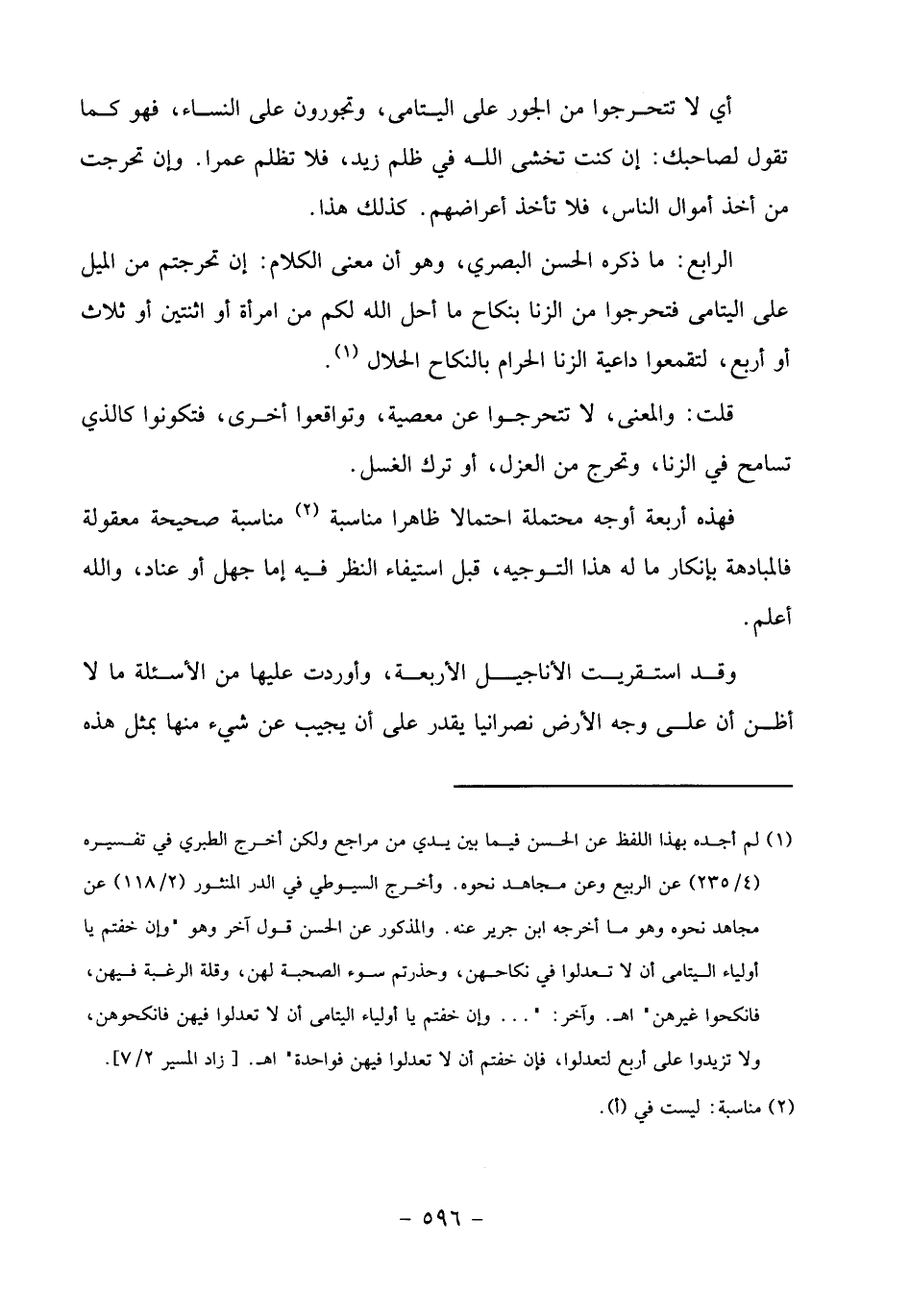 (1) لم أجده بهذا اللفظ عن الحسن فيما بين يدي من مراجع ولكن أخرج الطبري في تفسيره (4/ 235) عن الربيع وعن مجاهد نحوه. وأخرج السيوطي في الدر المنثور (2/ 118) عن مجاهد نحوه وهو ما أخرجه ابن جرير عنه. والمذكور عن الحسن قول آخر وهو" وإن خفتم يا أولياء اليتامى أن لا تعدلوا في نكاحهن، وحذرتم سوء الصحبة لهن، وقلة الرغبة فيهن، فانكحوا غيرهن" اهـ. وآخر:" ... وإن خفتم يا أولياء اليتامى أن لا تعدلوا فيهن فانكحوهن، ولا تزيدوا على أربع لتعدلوا، فإن خفتم أن لا تعدلوا فيهن فواحدة" اهـ. [زاد المسير 2/ 7].