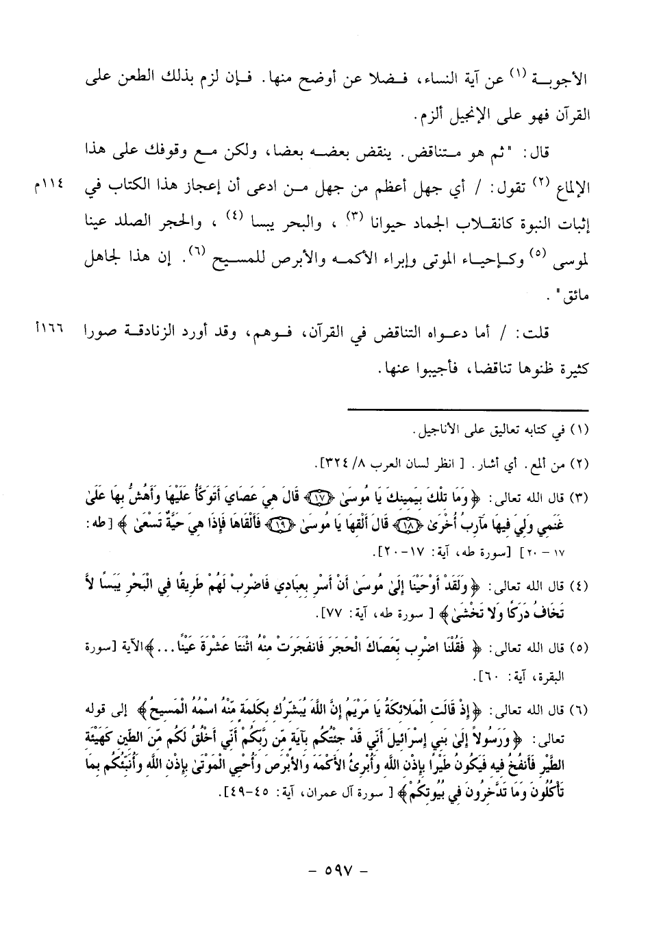 الأجوبة «1» عن آية النساء، فضلا عن أوضح منها. فإن لزم بذلك الطعن على القرآن فهو على الإنجيل ألزم.