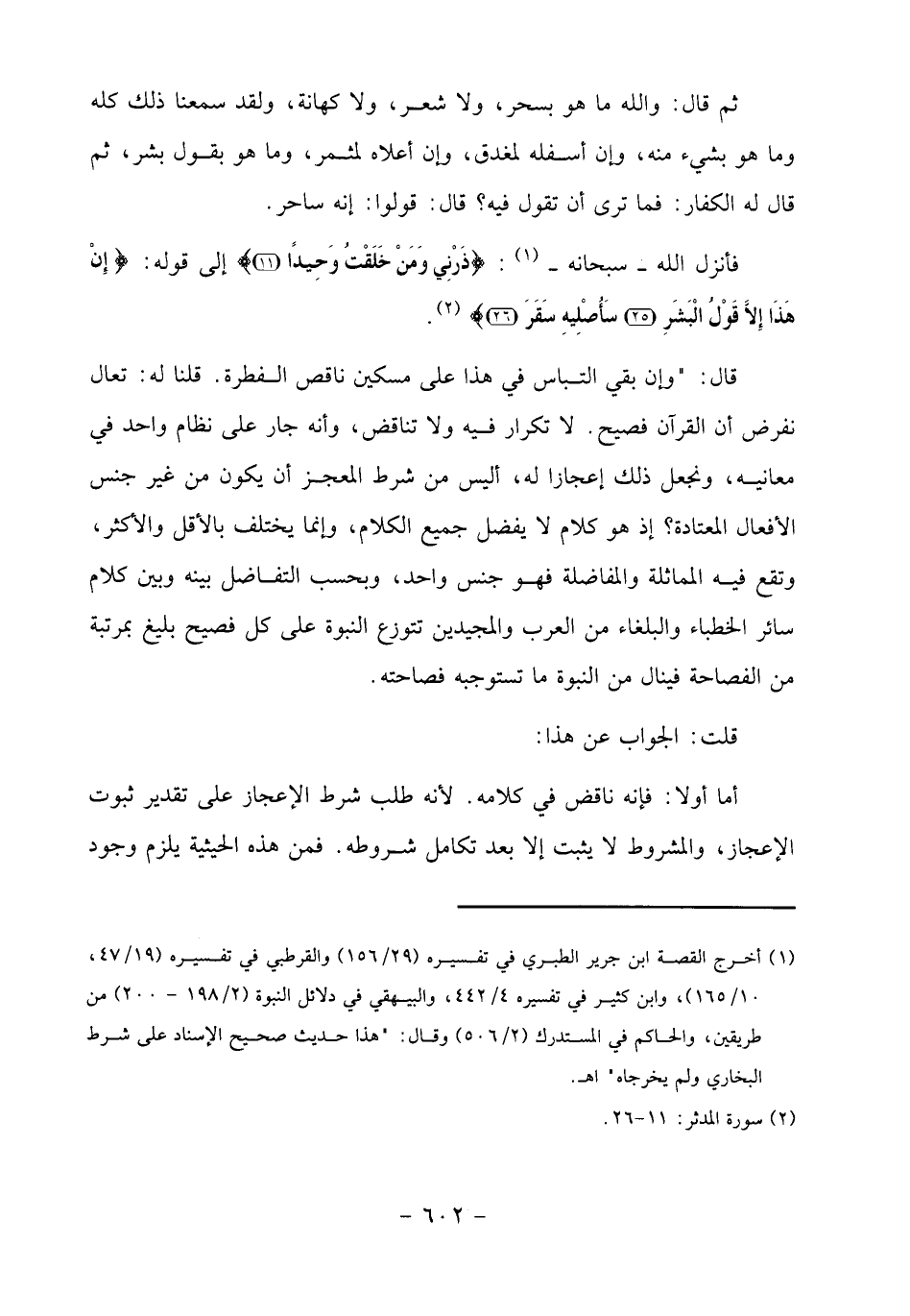 أما أولا: فإنه ناقض في كلامه. لأنه طلب شرط الإعجاز على تقدير ثبوت الإعجاز، والمشروط لا يثبت إلا بعد تكامل شروطه. فمن هذه الحيثية يلزم وجود