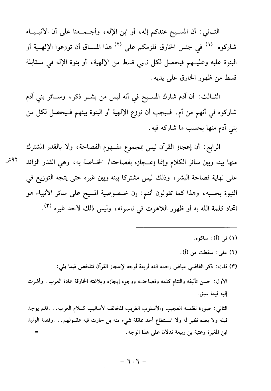 (3) قلت: ذكر القاضي عياض رحمه الله أربعة أوجه لإعجاز القرآن تتلخص فيما يلي: