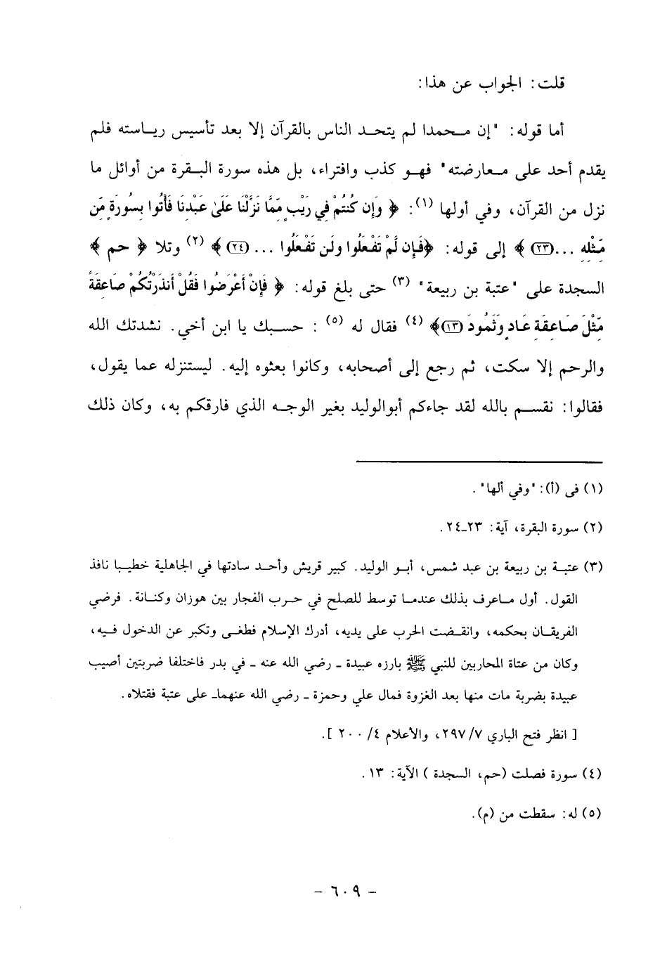 أما قوله:" إن محمدا لم يتحد الناس بالقرآن إلا بعد تأسيس رئاسته فلم يقدم أحد على معارضته" فهو كذب وافتراء، بل هذه سورة البقرة من أوائل ما نزل من القرآن، وفي أولها «1»: وإِنْ كُنْتُمْ فِي رَيْبٍ مِمَّا نَزَّلْنا عَلى عَبْدِنا فَأْتُوا بِسُورَةٍ مِنْ مِثْلِهِ ... (23) إلى قوله: فَإِنْ لَمْ تَفْعَلُوا ولَنْ تَفْعَلُوا ... (24) «2» وتلا حم السجدة على" عتبة بن ربيعة" «3» حتى بلغ قوله: فَإِنْ أَعْرَضُوا فَقُلْ أَنْذَرْتُكُمْ صاعِقَةً مِثْلَ صاعِقَةِ عادٍ وثَمُودَ (13) «4» فقال له «5»: حسبك يا ابن أخي. نشدتك الله والرحم إلا سكت، ثم رجع إلى أصحابه، وكانوا بعثوه إليه. ليستنزله عما يقول، فقالوا: نقسم بالله لقد جاءكم أبو الوليد بغير الوجه الذي فارقكم به، وكان ذلك