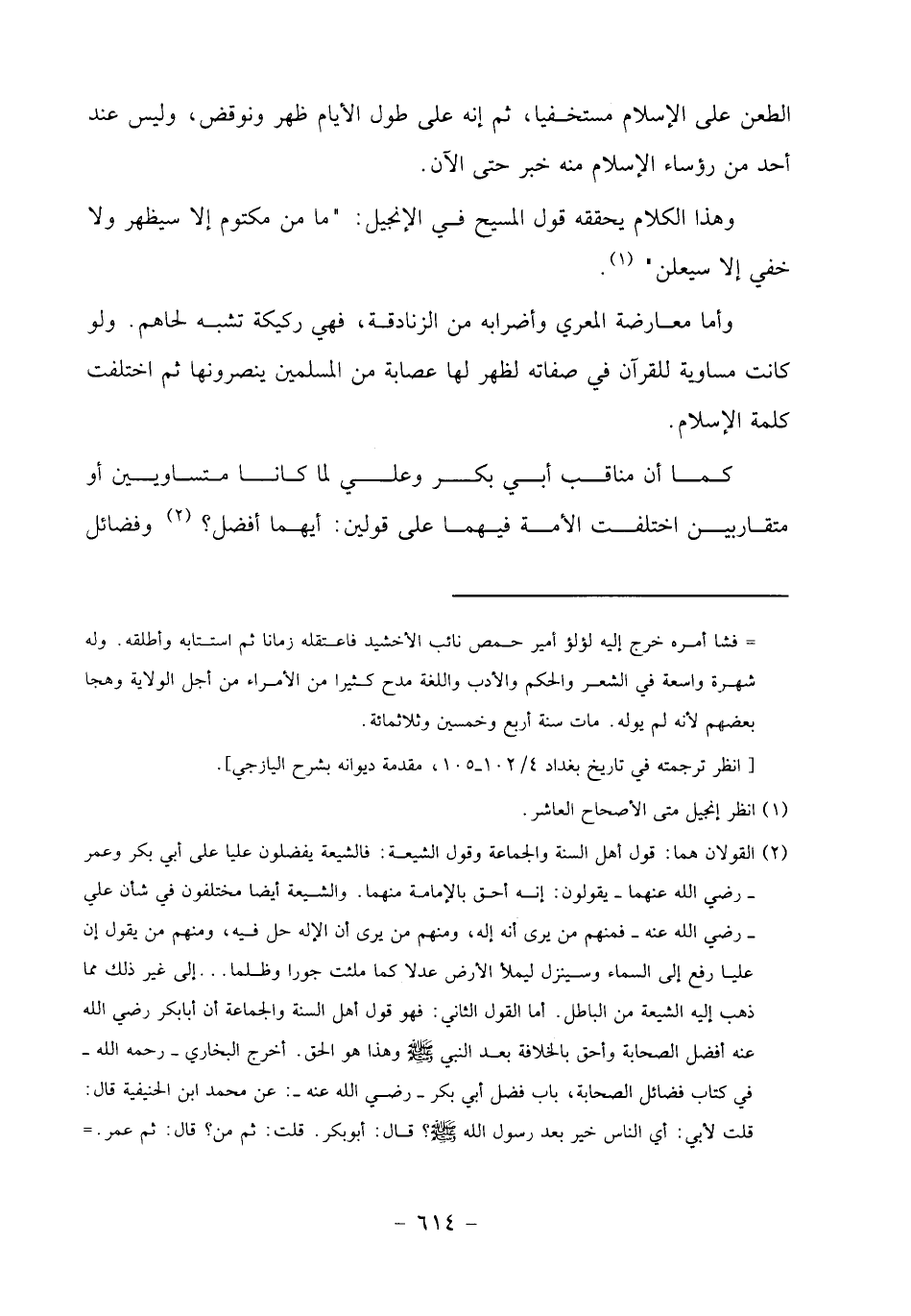 الطعن على الإسلام مستخفيا، ثم إنه على طول الأيام ظهر ونوقض، وليس عند أحد من رؤساء الإسلام منه خبر حتى الآن.