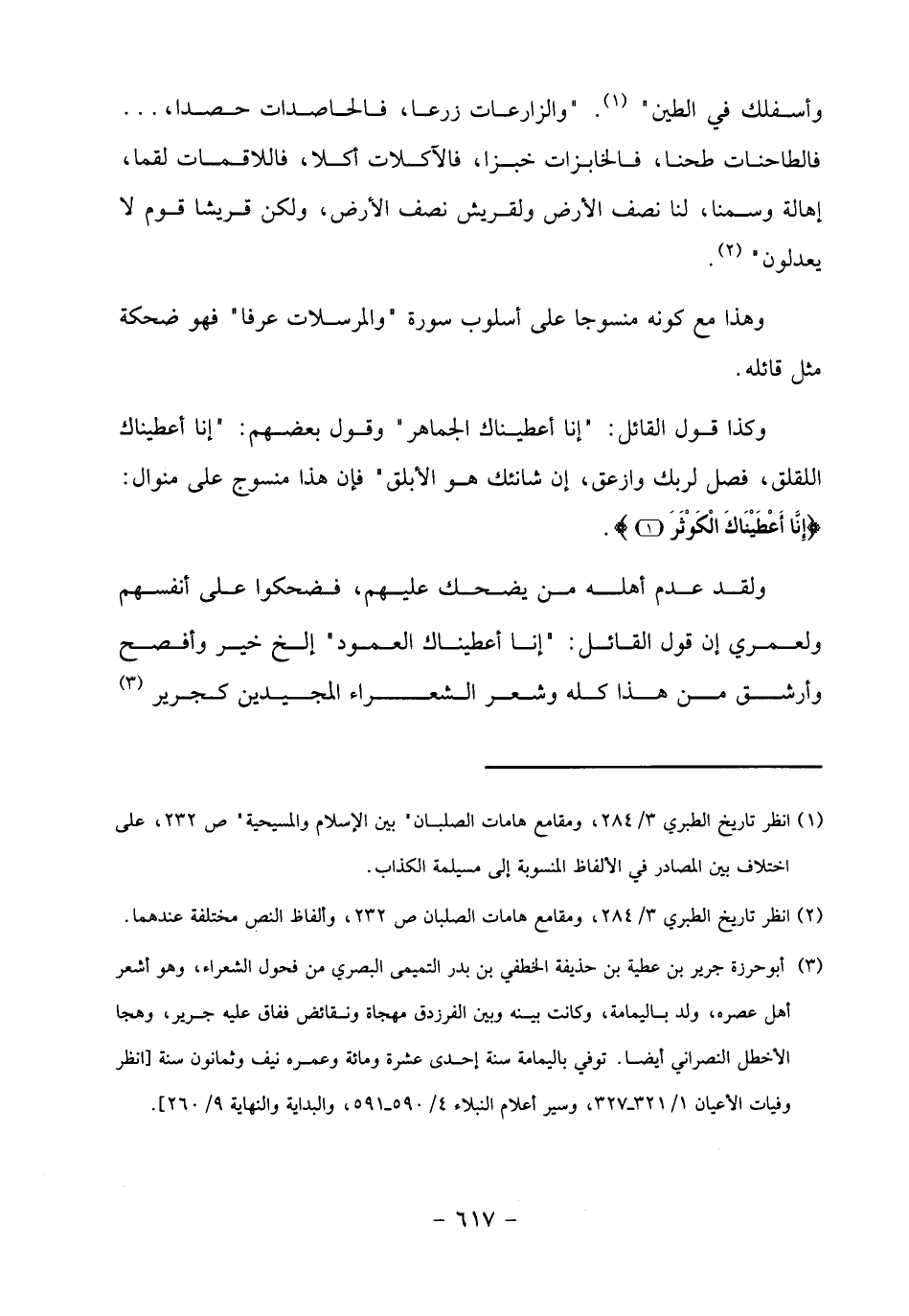 (1) انظر تاريخ الطبري 3/ 284، ومقامع هامات الصلبان" بين الإسلام والمسيحية" ص 232، على اختلاف بين المصادر في الألفاظ المنسوبة إلى مسيلمة الكذاب.