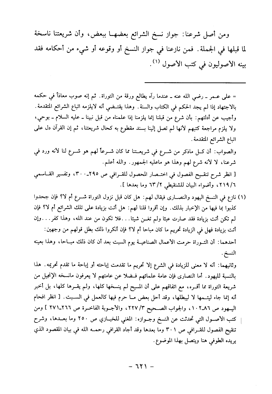 وثانيهما: أنه لا معنى للزيادة في الشرع إلا تحريم ما تقدمت إباحته أو إباحة ما تقدم تحريمه. هذا بالنسبة لليهود. أما النصارى فإن عامة علمائهم فضلا عن عامتهم لا يعرفون ما نسخه الإنجيل من شريعة التوراة مما أقره، مع اتفاقهم على أن المسيح لم ينسخها كلها، ولم يقرها كلها، بل أخبر أنه إنما جاء ليتمها لا ليبطلها، وقد أحل بعض ما حرم فيها كالعمل في السبت. [انظر افحام اليهود ص 86 - 102، والجواب الصحيح 3/ 227، والأجوبة الفاخرة ص 266 - 271] ومن كتب الأصول التي تحدثت عن النسخ وجوازه: المغني للخبازي ص 250 وما بعدها، وشرح تنقيح الفصول للقرافي ص 301 وما بعدها وقد أجاد القرافي رحمه الله في بيان المقصود الذي يريده الطوفي هنا ويتصل بهذا الموضوع.