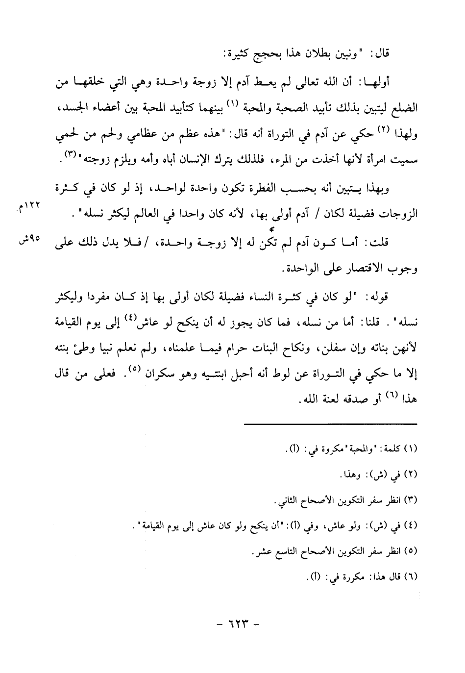 قوله:" لو كان في كثرة النساء فضيلة لكان أولى بها إذ كان مفردا وليكثر نسله". قلنا: أما من نسله، فما كان يجوز له أن ينكح لو عاش «4» إلى يوم القيامة لأنهن بناته وإن سفلن، ونكاح البنات حرام فيما علمناه، ولم نعلم نبيا وطئ بنته إلا ما حكي في التوراة عن لوط أنه أحبل ابنتيه وهو سكران «5». فعلى من قال هذا «6» أو صدقه لعنة الله.