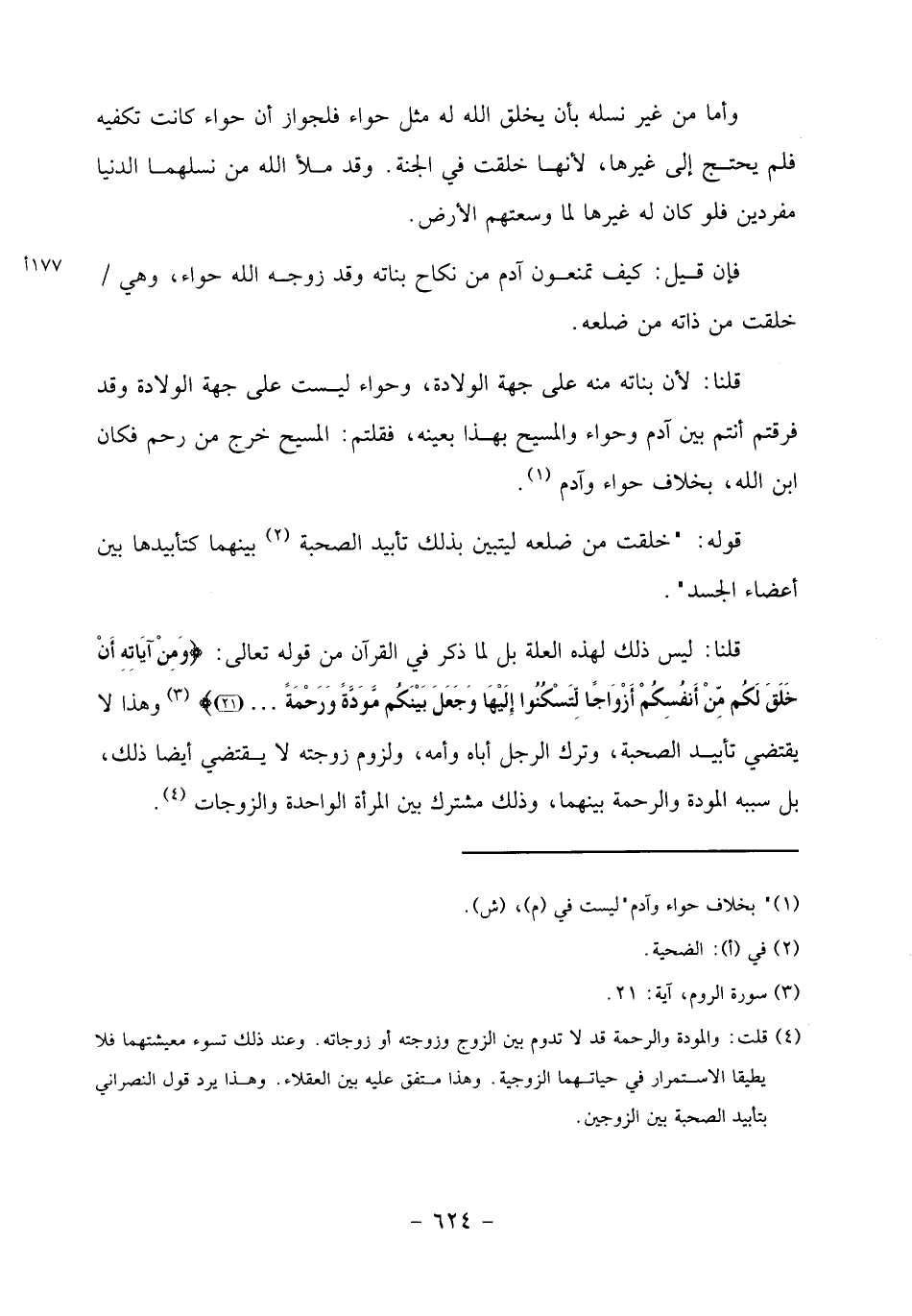 قلنا: لأن بناته منه على جهة الولادة، وحواء ليست على جهة الولادة وقد فرقتم أنتم بين آدم وحواء والمسيح بهذا بعينه، فقلتم: المسيح خرج من رحم فكان ابن الله، بخلاف حواء وآدم «1».