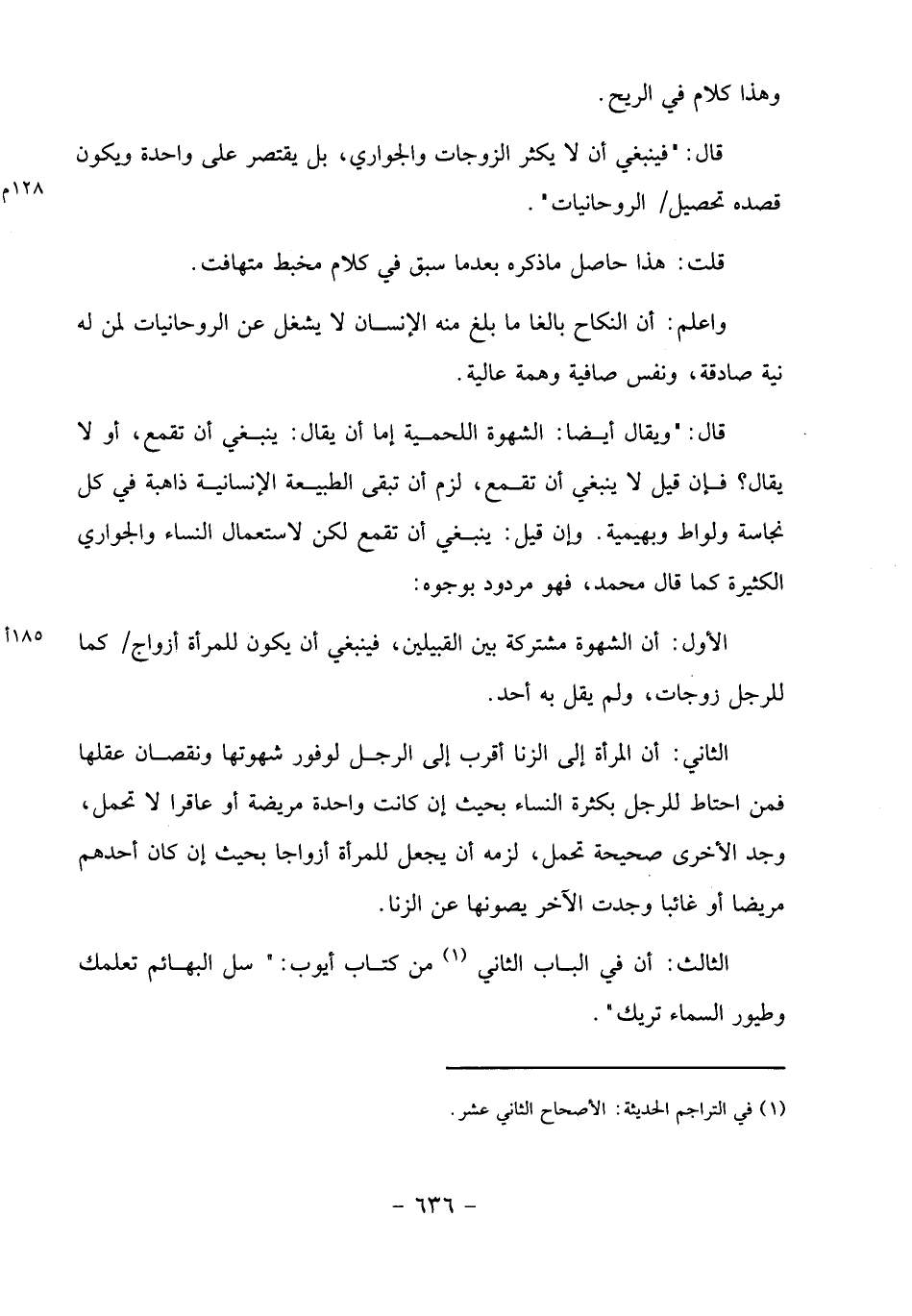 قال:" ويقال أيضا: الشهوة اللحمية إما أن يقال: ينبغي أن تقمع، أو لا يقال؟ فإن قيل لا ينبغي أن تقمع، لزم أن تبقى الطبيعة الإنسانية ذاهبة في كل نجاسة ولواط وبهيمية. وإن قيل: ينبغي أن تقمع لكن لاستعمال النساء والجواري الكثيرة كما قال محمد، فهو مردود بوجوه: