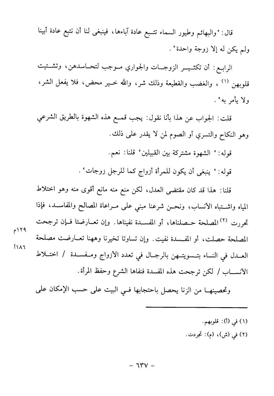 الرابع: أن تكثير الزوجات والجواري موجب لتحاسدهن، وتشتيت قلوبهن «1»، والغضب والقطيعة وذلك شر، والله خير محض، فلا يفعل الشر، ولا يأمر به".