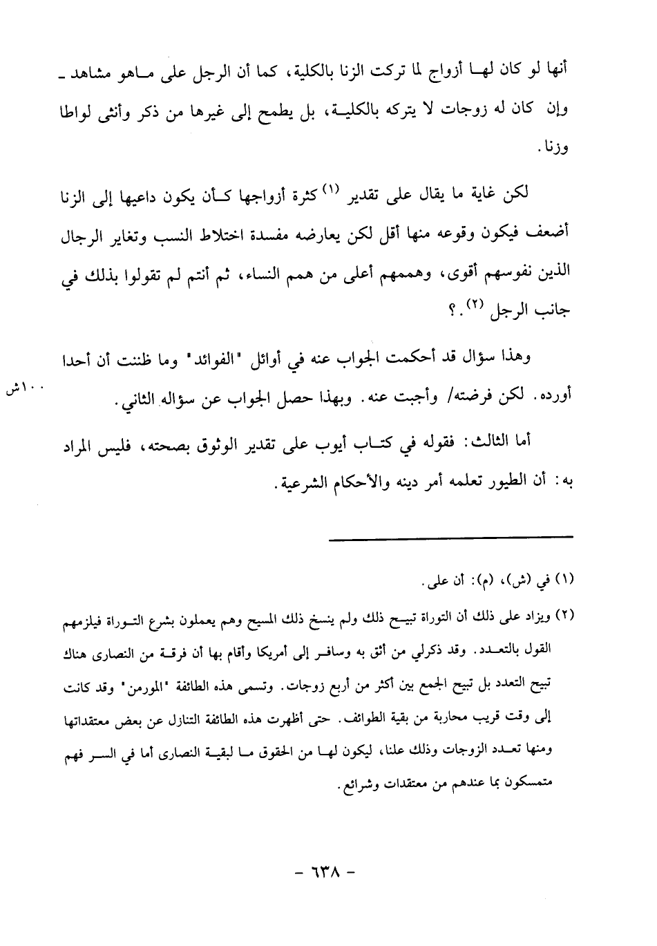 (2) ويزاد على ذلك أن التوراة تبيح ذلك ولم ينسخ ذلك المسيح وهم يعملون بشرع التوراة فيلزمهم القول بالتعدد. وقد ذكر لي من أثق به وسافر إلى أمريكا وأقام بها أن فرقة من النصارى هناك تبيح التعدد بل تبيح الجمع بين أكثر من أربع زوجات. وتسمى هذه الطائفة" المورمن" وقد كانت إلى وقت قريب محاربة من بقية الطوائف. حتى أظهرت هذه الطائفة التنازل عن بعض معتقداتها ومنها تعدد الزوجات وذلك علنا، ليكون لها من الحقوق ما لبقية النصارى أما في السر فهم متمسكون بما عندهم من معتقدات وشرائع.