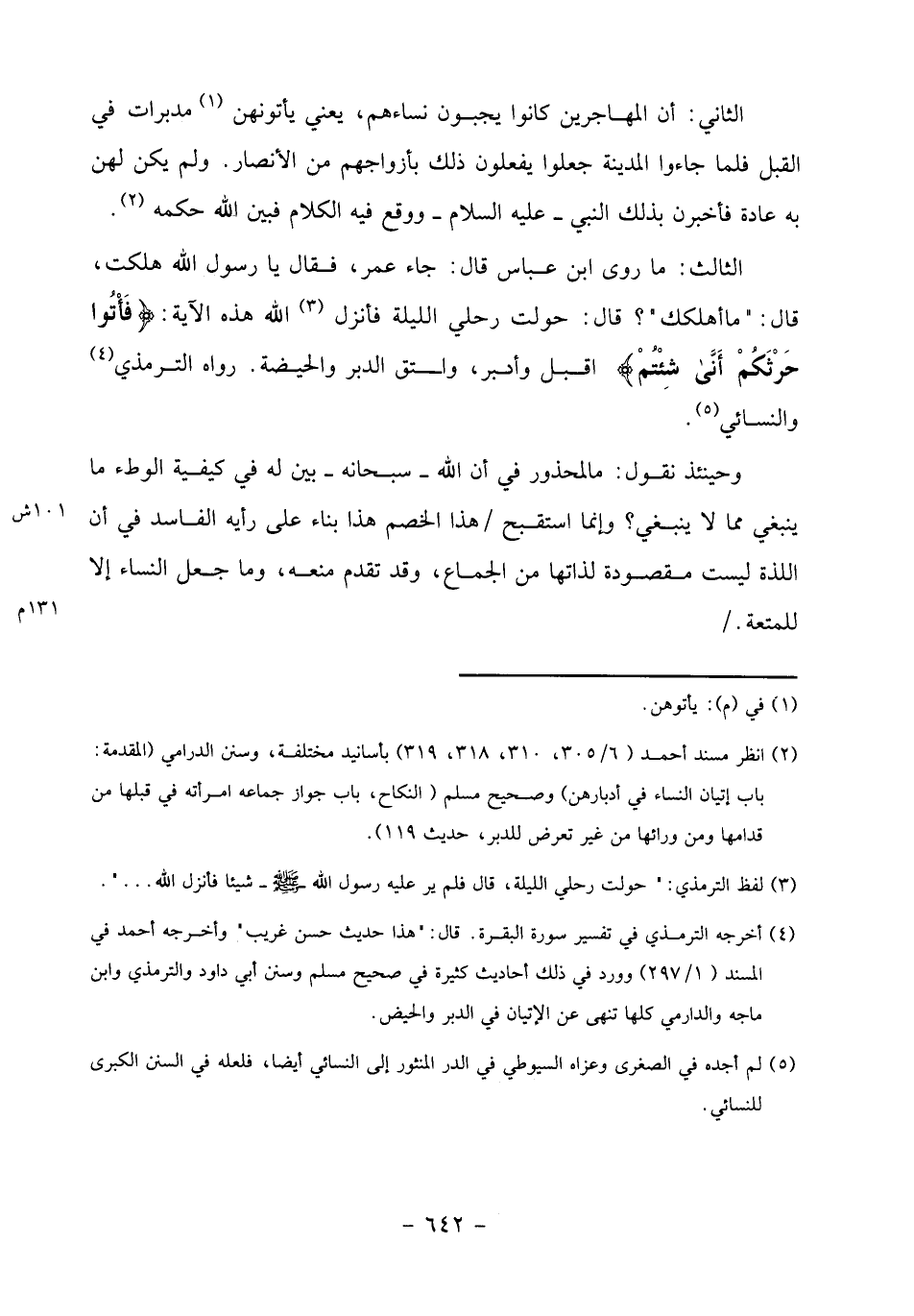 (4) أخرجه الترمذي في تفسير سورة البقرة. قال:" هذا حديث حسن غريب" وأخرجه أحمد في المسند (1/ 297) وورد في ذلك أحاديث كثيرة في صحيح مسلم وسنن أبي داود والترمذي وابن ماجه والدارمي كلها تنهى عن الإتيان في الدبر والحيض.