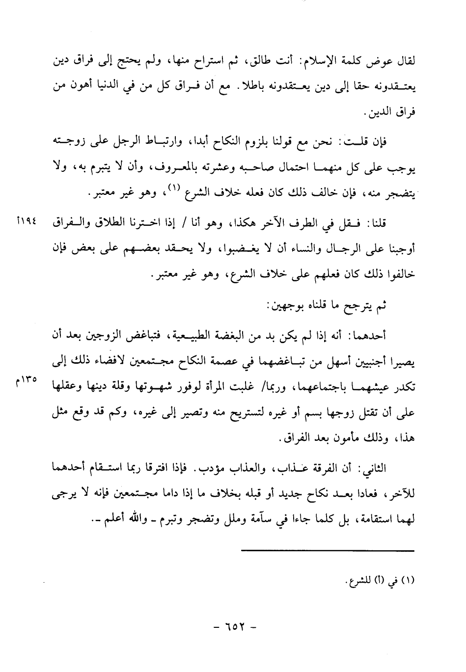 فإن قلت: نحن مع قولنا بلزوم النكاح أبدا، وارتباط الرجل على زوجته يوجب على كل منهما احتمال صاحبه وعشرته بالمعروف، وأن لا يتبرم به، ولا يتضجر منه، فإن خالف ذلك كان فعله خلاف الشرع «1»، وهو غير معتبر.