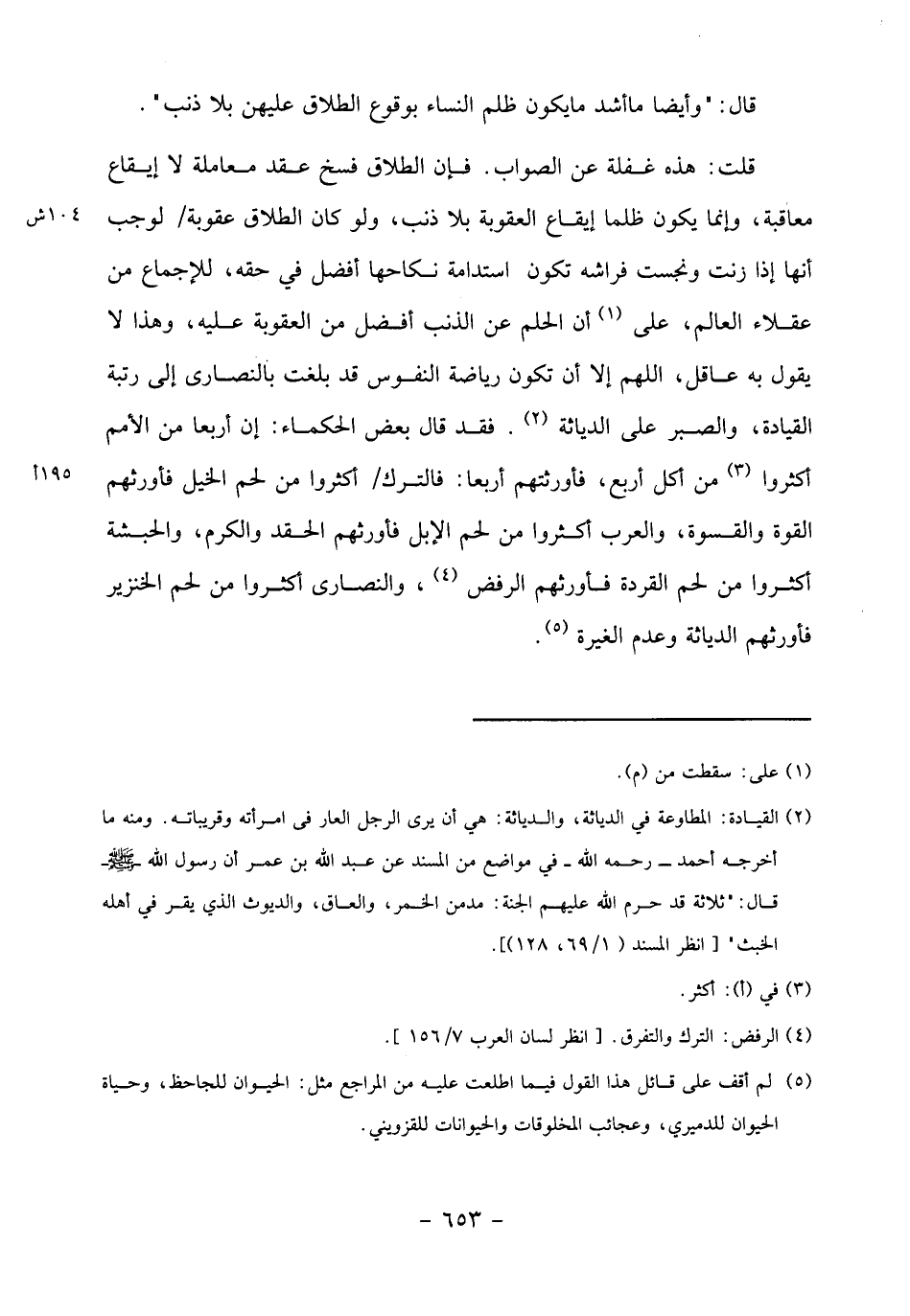 قلت: هذه غفلة عن الصواب. فإن الطلاق فسخ عقد معاملة لا إيقاع معاقبة، وإنما يكون ظلما إيقاع العقوبة بلا ذنب، ولو كان الطلاق عقوبة/ لوجب أنها إذا زنت ونجست فراشه تكون استدامة نكاحها أفضل في حقه، للإجماع من عقلاء العالم، على «1» أن الحلم عن الذنب أفضل من العقوبة عليه، وهذا لا يقول به عاقل، اللهم إلا أن تكون رياضة النفوس قد بلغت بالنصارى إلى رتبة القيادة، والصبر على الدياثة «2». فقد قال بعض الحكماء: إن أربعا من الأمم أكثروا «3» من أكل أربع، فأورثتهم أربعا: فالترك/ أكثروا من لحم الخيل فأورثهم القوة والقسوة، والعرب أكثروا من لحم الإبل فأورثهم الحقد والكرم، والحبشة أكثروا من لحم القردة فأورثهم الرفض «4»، والنصارى أكثروا من لحم الخنزير فأورثهم الدياثة وعدم الغيرة «5».