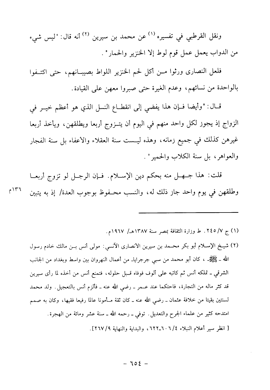 فلعل النصارى ورثوا من أكل لحم الخنزير اللواط بصبيانهم، حتى اكتفوا بالواحدة من نسائهم، وعدم الغيرة حتى صبروا معهن على القيادة.