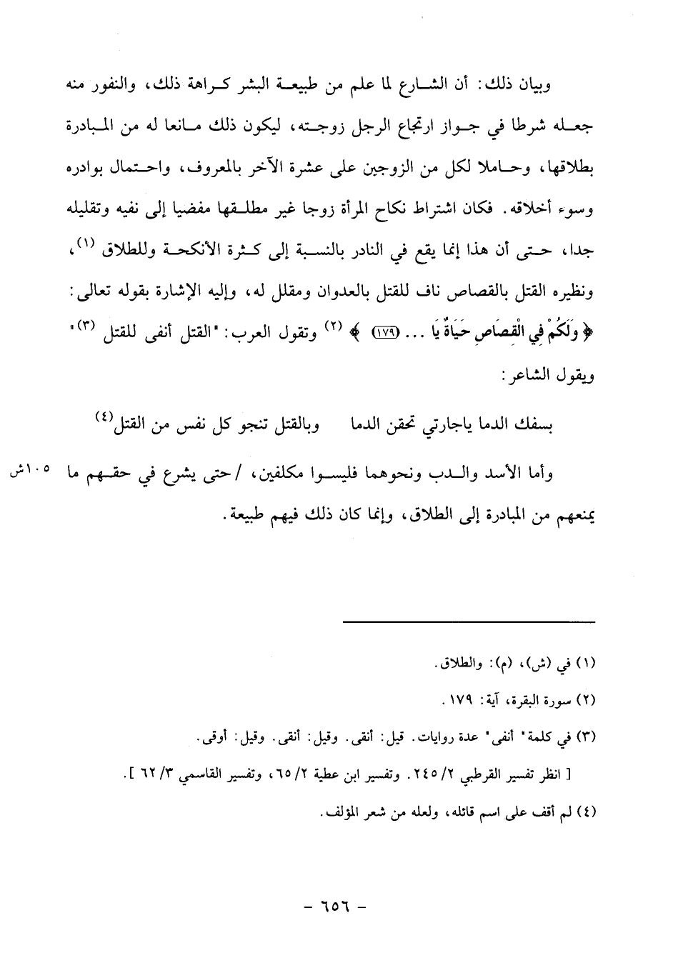 بسفك الدما يا جارتي تحقن الدما وبالقتل تنجو كل نفس من القتل «4» وأما الأسد والدب ونحوهما فليسوا مكلفين،/ حتى يشرع في حقهم ما يمنعهم من المبادرة إلى الطلاق، وإنما كان ذلك فيهم طبيعة.
