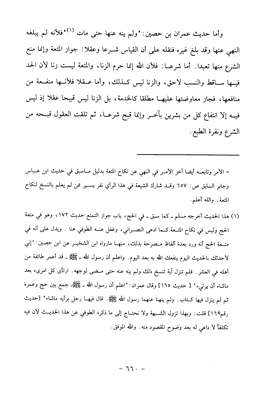 (1) هذا الحديث أخرجه مسلم- كما سبق- في الحج، باب جواز التمتع حديث 172، وهو في متعة الحج وليس في نكاح المتعة كما ادعى النصراني، وغفل عنه الطوفي هنا. ويدل على أنه في متعة الحج أنه ورد بعدة ألفاظ مصرحة بذلك، منها ما رواه ابن الشخير عن ابن حصين:" إني لأحدثك بالحديث اليوم ينفعك الله به بعد اليوم. واعلم أن رسول الله- صلى الله عليه وسلم- قد أعمر طائفة من أهله في العشر. فلم تنزل آية تنسخ ذلك ولم ينه عنه حتى مضى لوجهه. ارتأى كل امرئ بعد ما شاء أن يرتئ" [حديث 165] وقال عمران:" اعلم أن رسول الله- صلى الله عليه وسلم- جمع بين حج وعمرة ثم لم ينزل فيها كتاب. ولم ينهنا عنهما رسول الله صلى الله عليه وسلم. قال فيها رجل برأيه ما شاء" [حديث رقم 169] قلت: وبهذا تزول الشبهة ولا نحتاج إلى ما ذكره الطوفي عن هذا الحديث لأن فيه تكلفا لا داعي له بعد وضوح المقصود منه. والله الموفق.