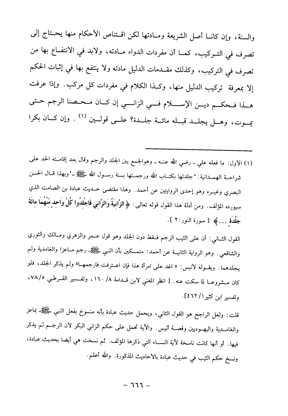 (1) الأول: ما فعله علي- رضي الله عنه- وهو الجمع بين الجلد والرجم وقال بعد إقامته الحد على شراحة الهمدانية:" جلدتها بكتاب الله ورجمتها بسنة رسول الله- صلى الله عليه وسلم-" وبهذا قال الحسن البصري وغيره وهو إحدى الروايتين عن أحمد. وهذا مقتضى حديث عبادة بن الصامت الذي سيورده المؤلف. ومن أدلة هذا القول قوله تعالى: الزَّانِيَةُ والزَّانِي فَاجْلِدُوا كُلَّ واحِدٍ مِنْهُما مِائَةَ جَلْدَةٍ ... [سورة النور: 2].