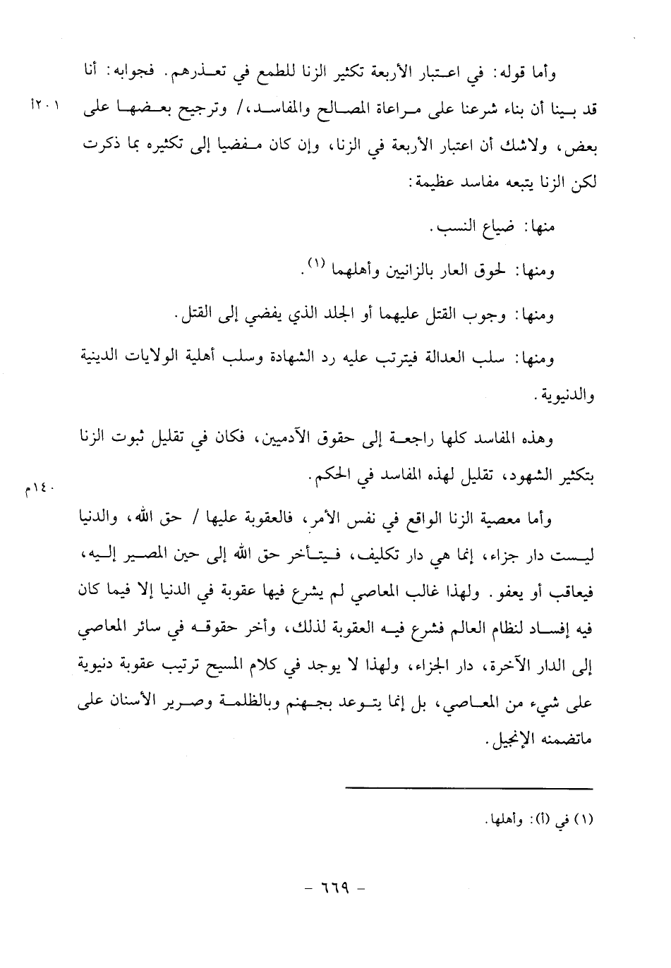 وأما معصية الزنا الواقع في نفس الأمر، فالعقوبة عليها/ حق الله، والدنيا ليست دار جزاء، إنما هي دار تكليف، فيتأخر حق الله إلى حين المصير إليه، فيعاقب أو يعفو. ولهذا غالب المعاصي لم يشرع فيها عقوبة في الدنيا إلا فيما كان فيه إفساد لنظام العالم فشرع فيه العقوبة لذلك، وأخر حقوقه في سائر المعاصي إلى الدار الآخرة، دار الجزاء، ولهذا لا يوجد في كلام المسيح ترتيب عقوبة دنيوية على شيء من المعاصي، بل إنما يتوعد بجهنم وبالظلمة وصرير الأسنان على ما تضمنه الإنجيل.