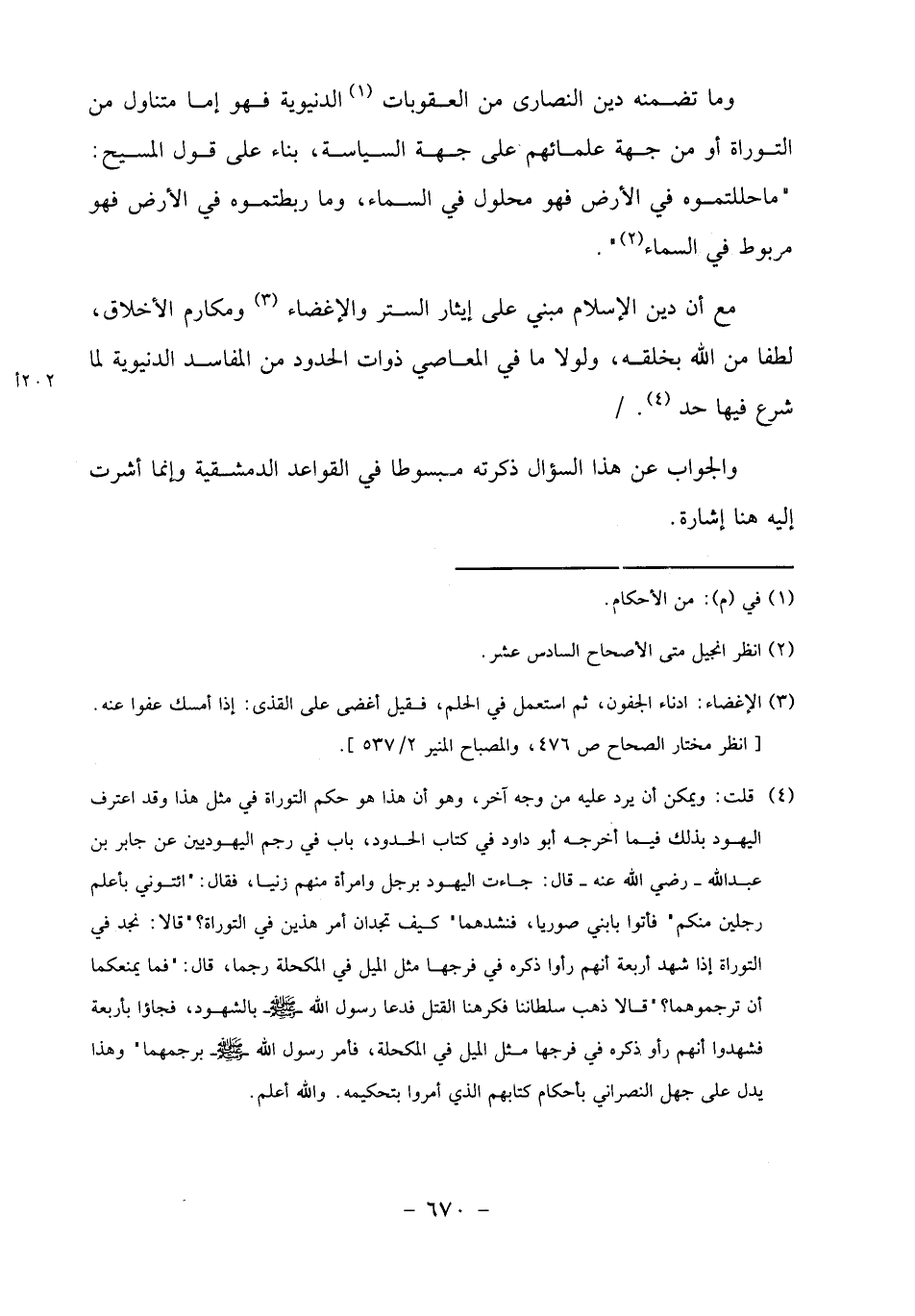 (4) قلت: ويمكن أن يرد عليه من وجه آخر، وهو أن هذا هو حكم التوراة في مثل هذا وقد اعترف اليهود بذلك فيما أخرجه أبو داود في كتاب الحدود، باب في رجم اليهوديين عن جابر بن عبد الله- رضي الله عنه- قال: جاءت اليهود برجل وامرأة منهم زنيا، فقال:" ائتوني بأعلم رجلين منكم" فأتوا بابني صوريا، فنشدهما" كيف تجدان أمر هذين في التوراة؟ " قالا: نجد في التوراة إذا شهد أربعة أنهم رأوا ذكره في فرجها مثل الميل في المكحلة رجما، قال:" فما يمنعكما أن ترجموهما؟ " قالا ذهب سلطاننا فكرهنا القتل فدعا رسول الله- صلى الله عليه وسلم- بالشهود، فجاءوا بأربعة فشهدوا أنهم رأوا ذكره في فرجها مثل الميل في المكحلة، فأمر رسول الله- صلى الله عليه وسلم- برجمهما" وهذا يدل على جهل النصراني بأحكام كتابهم الذي أمروا بتحكيمه. والله أعلم.