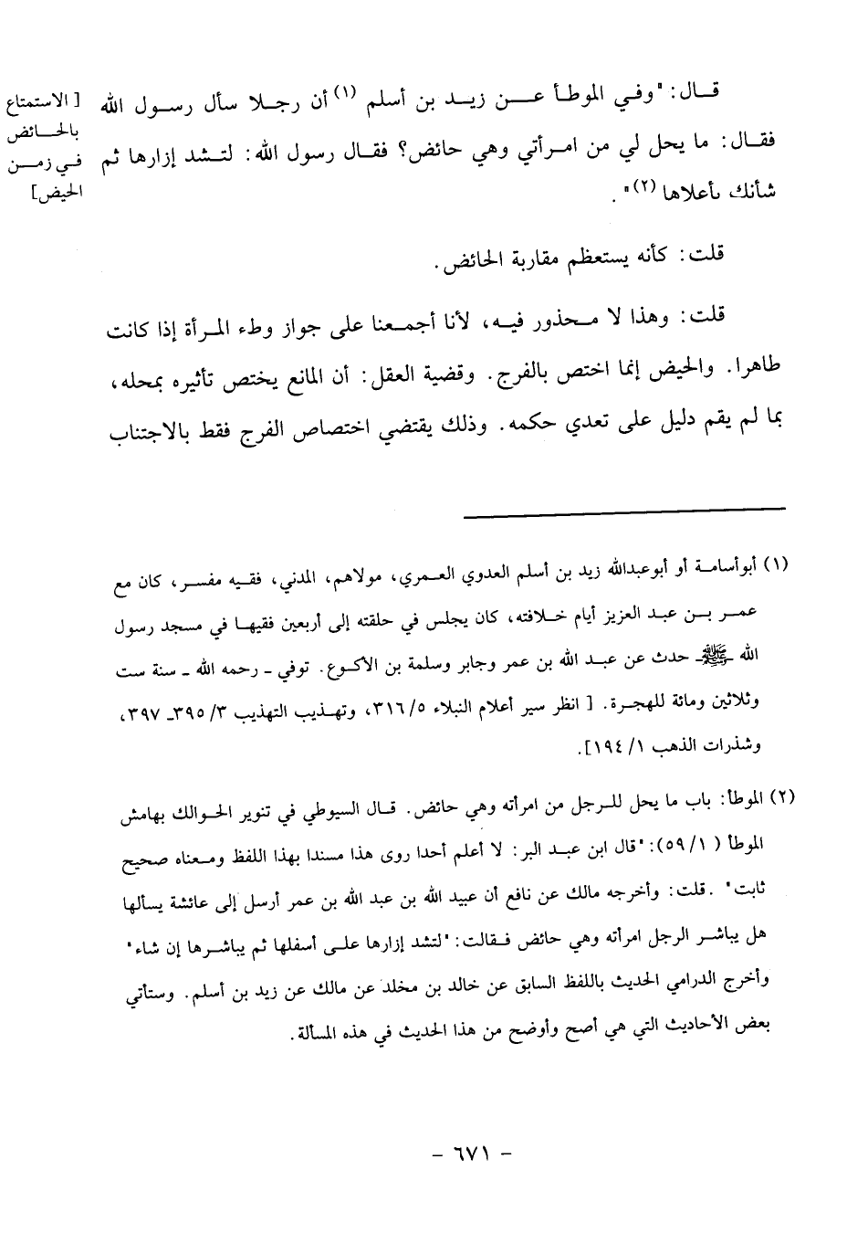 قال:" وفي الموطأ عن زيد بن أسلم «1» أن رجلا سأل رسول الله فقال: ما يحل لي من امرأتي وهي حائض؟ فقال رسول الله: لتشد إزارها ثم شأنك بأعلاها «2» ".