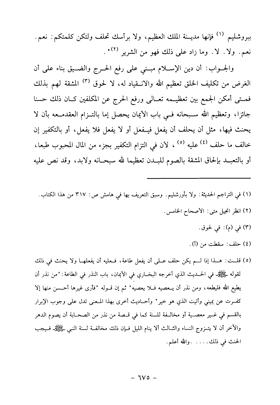 والجواب: أن دين الإسلام مبني على رفع الحرج والضيق بناء على أن الغرض من تكليف الخلق تعظيم الله والانقياد له، لا لحوق «3» المشقة لهم بذلك فمتى أمكن الجمع بين تعظيمه تعالى ورفع الحرج عن المكلفين كان ذلك حسنا جائزا، وتعظيم الله سبحانه في باب الأيمان يحصل إما بالتزام العقد معه بأن لا يحنث فيها، مثل أن يحلف أن يفعل فيفعل أو لا يفعل فلا يفعل، أو بالتكفير إن خالف ما حلف «4» عليه «5»، لأن في التزام التكفير بجزء من المال المحبوب طبعا، أو بالتعبد بإلحاق المشقة بالصوم للبدن تعظيما لله سبحانه ولا بدّ، وقد نص عليه