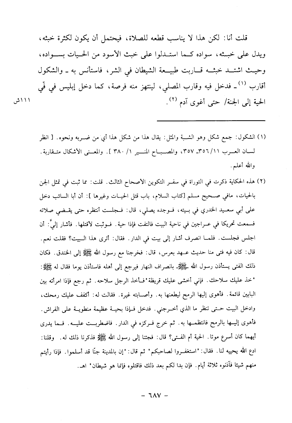 (2) هذه الحكاية ذكرت في التوراة في سفر التكوين الأصحاح الثالث. قلت: مما ثبت في تمثل الجن بالحيات، ما في صحيح مسلم [كتاب السلام، باب قتل الحيات وغيرها]: أن أبا السائب دخل على أبي سعيد الخدري في بيته، فوجده يصلي، قال: فجلست أنتظره حتى يقضي صلاته فسمعت تحريكا في عراجين في ناحية البيت فالتفت فإذا حية. فوثبت لأقتلها. فأشار إليّ: أن اجلس فجلست. فلما انصرف أشار إلى بيت في الدار. فقال: أترى هذا البيت؟ فقلت نعم.