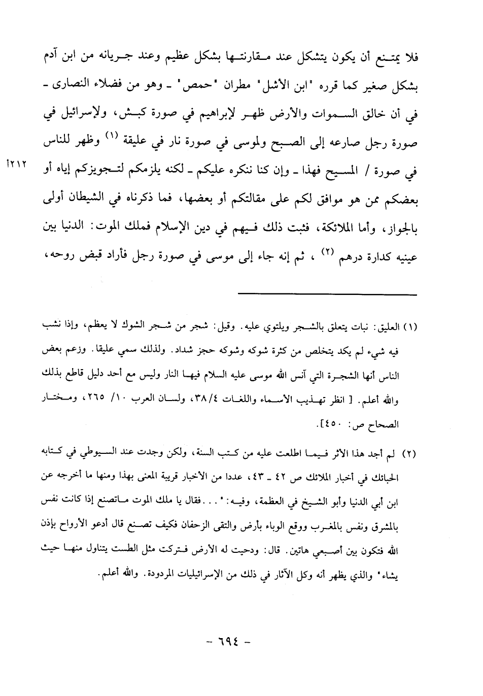فلا يمتنع أن يكون يتشكل عند مقارنتها بشكل عظيم وعند جريانه من ابن آدم بشكل صغير كما قرره" ابن الأشل" مطران" حمص"- وهو من فضلاء النصارى- في أن خالق السموات والأرض ظهر لإبراهيم في صورة كبش، ولإسرائيل في صورة رجل صارعه إلى الصبح ولموسى في صورة نار في عليقة «1» وظهر للناس في صورة/ المسيح فهذا- وإن كنا ننكره عليكم- لكنه يلزمكم لتجويزكم إياه أو بعضكم ممن هو موافق لكم على مقالتكم أو بعضها، فما ذكرناه في الشيطان أولى بالجواز، وأما الملائكة، فثبت ذلك فيهم في دين الإسلام فملك الموت: الدنيا بين عينيه كدارة درهم «2»، ثم إنه جاء إلى موسى في صورة رجل فأراد قبض روحه،