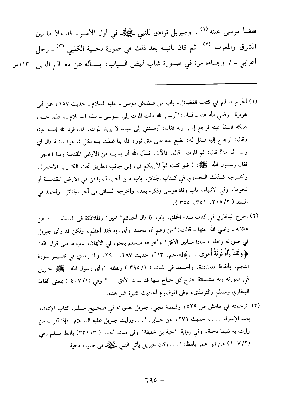 (1) أخرج مسلم في كتاب الفضائل، باب من فضائل موسى- عليه السلام- حديث 157، عن أبي هريرة- رضي الله عنه- قال:" أرسل الله ملك الموت إلى موسى- عليه السلام-، فلما جاءه صكه ففقأ عينه فرجع إلى ربه فقال: أرسلتني إلى عبد لا يريد الموت. قال فرد الله إليه عينه وقال: ارجع إليه فقل له: يضع يده على متن ثور، فله بما غطت يده بكل شعرة سنة قال أي رب! ثم مه؟ قال: ثم الموت. قال: فالآن. فسأل الله أن يدنيه من الأرض المقدسة رمية الحجر.