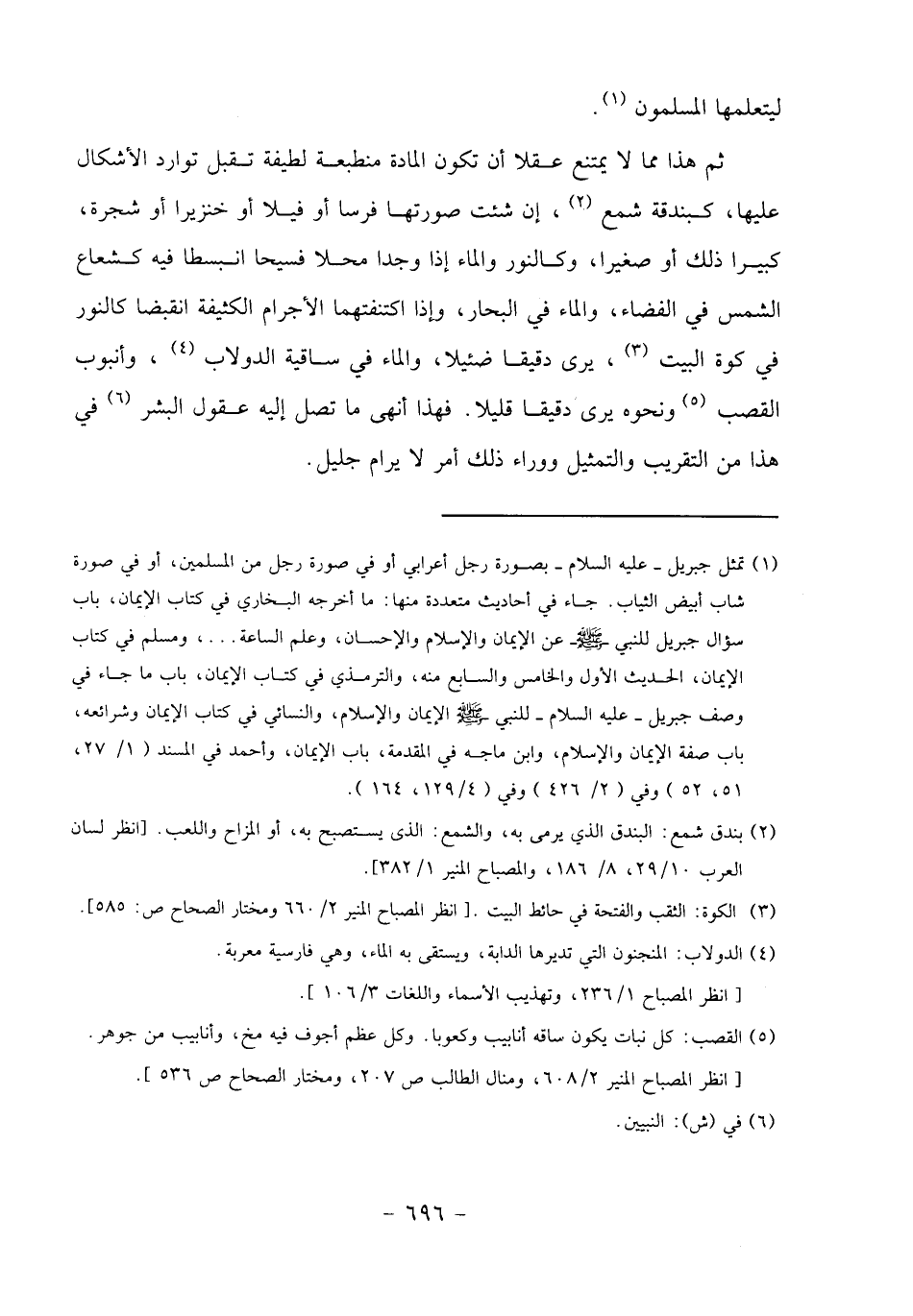 ثم هذا مما لا يمتنع عقلا أن تكون المادة منطبعة لطيفة تقبل توارد الأشكال عليها، كبندقة شمع «2»، إن شئت صورتها فرسا أو فيلا أو خنزيرا أو شجرة، كبيرا ذلك أو صغيرا، وكالنور والماء إذا وجدا محلا فسيحا انبسطا فيه كشعاع الشمس في الفضاء، والماء في البحار، وإذا اكتنفتهما الأجرام الكثيفة انقبضا كالنور في كوة البيت «3»، يرى دقيقا ضئيلا، والماء في ساقية الدولاب «4»، وأنبوب القصب «5» ونحوه يرى دقيقا قليلا. فهذا أنهى ما تصل إليه عقول البشر «6» في هذا من التقريب والتمثيل ووراء ذلك أمر لا يرام جليل.