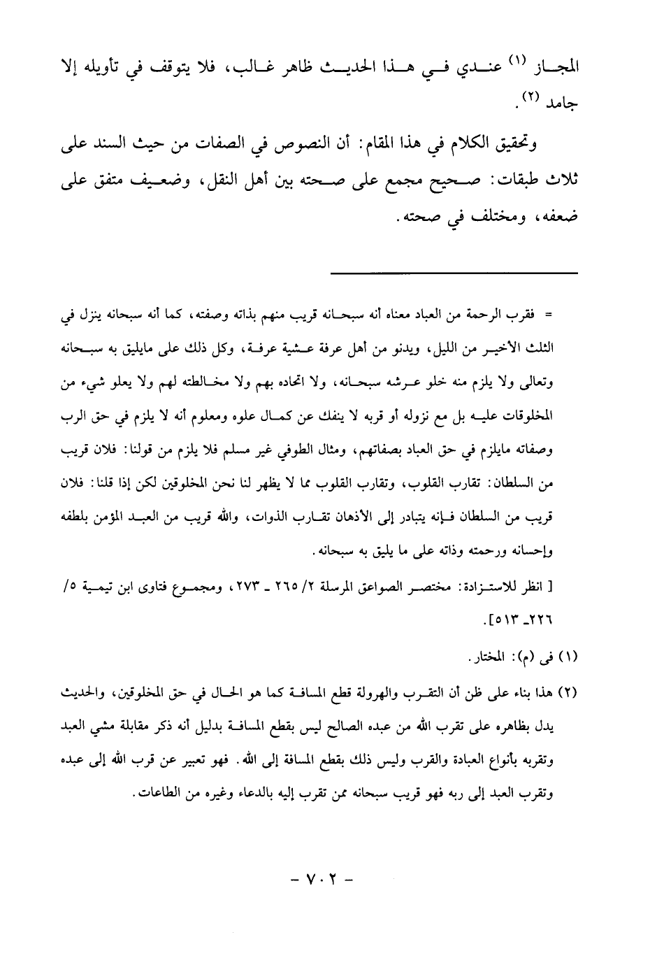 وتحقيق الكلام في هذا المقام: أن النصوص في الصفات من حيث السند على ثلاث طبقات: صحيح مجمع على صحته بين أهل النقل، وضعيف متفق على ضعفه، ومختلف في صحته.
