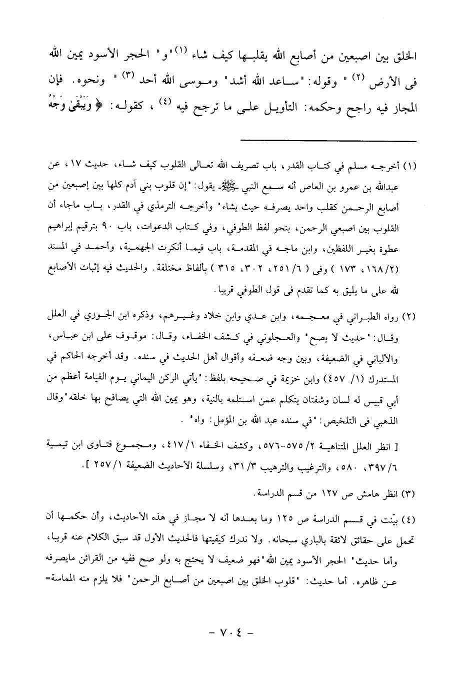 (4) بيّنت في قسم الدراسة ص 125 وما بعدها أنه لا مجاز في هذه الأحاديث، وأن حكمها أن تحمل على حقائق لائقة بالباري سبحانه. ولا ندرك كيفيتها فالحديث الأول قد سبق الكلام عنه قريبا، وأما حديث" الحجر الأسود يمين الله" فهو ضعيف لا يحتج به ولو صح ففيه من القرائن ما يصرفه عن ظاهره. أما حديث:" قلوب الخلق بين اصبعين من أصابع الرحمن" فلا يلزم منه المماسة-