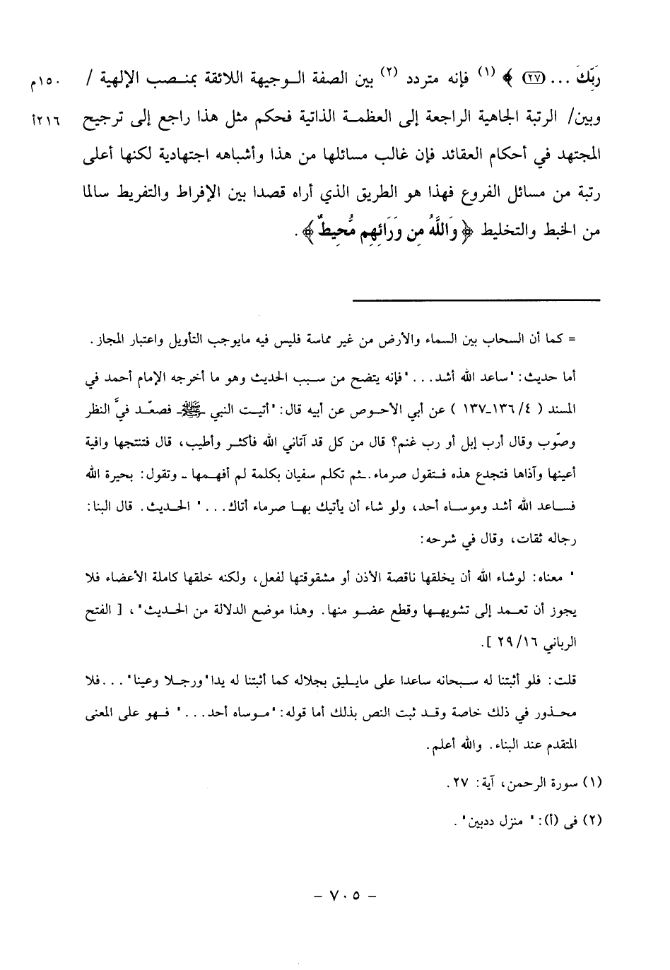 رَبِّكَ ... (27) «1» فإنه متردد «2» بين الصفة الوجيهة اللائقة بمنصب الإلهية/ وبين/ الرتبة الجاهية الراجعة إلى العظمة الذاتية فحكم مثل هذا راجع إلى ترجيح المجتهد في أحكام العقائد فإن غالب مسائلها من هذا وأشباهه اجتهادية لكنها أعلى رتبة من مسائل الفروع فهذا هو الطريق الذي أراه قصدا بين الإفراط والتفريط سالما من الخبط والتخليط واللَّهُ مِنْ وَرائِهِمْ مُحِيطٌ.