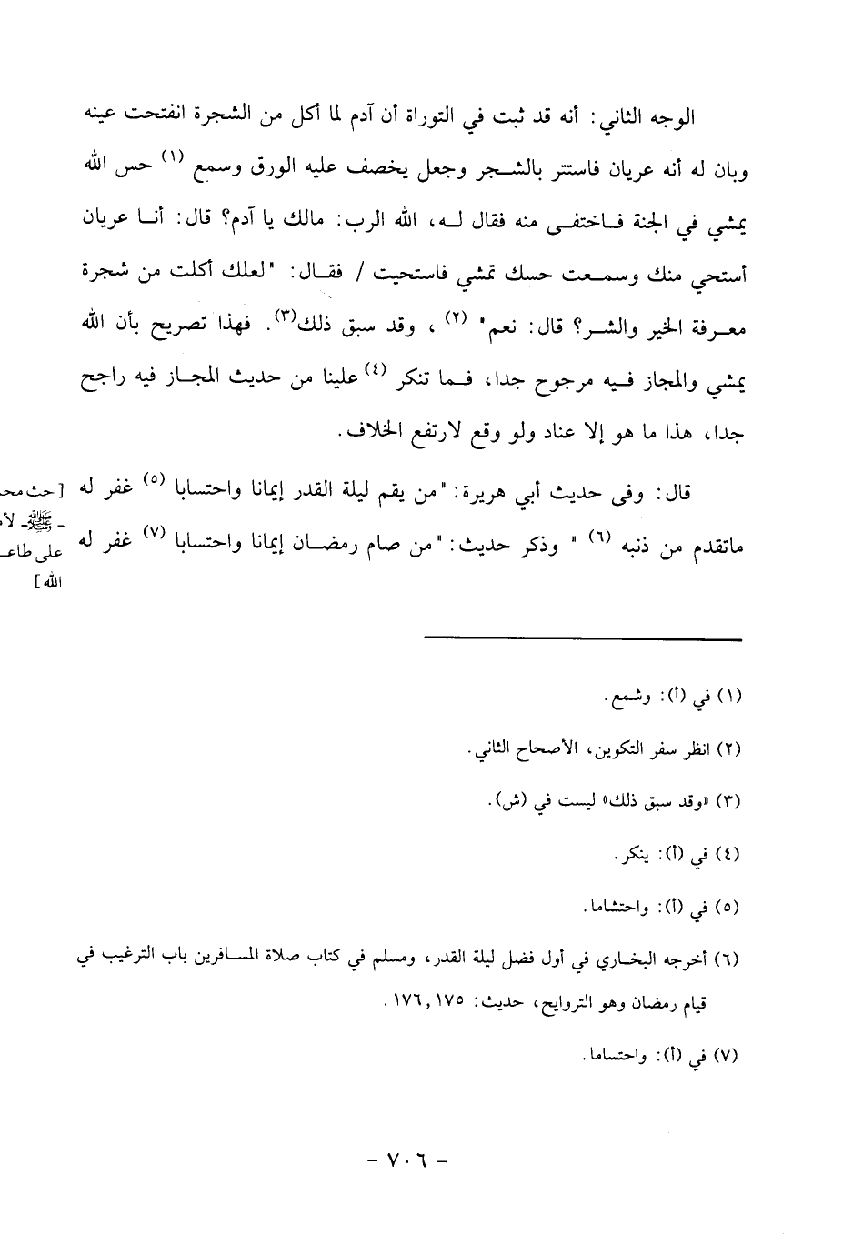 الوجه الثاني: أنه قد ثبت في التوراة أن آدم لما أكل من الشجرة انفتحت عينه وبان له أنه عريان فاستتر بالشجر وجعل يخصف عليه الورق وسمع «1» حس الله يمشي في الجنة فاختفى منه فقال له، الله الرب: ما لك يا آدم؟ قال: أنا عريان أستحي منك وسمعت حسك تمشي فاستحيت/ فقال:" لعلك أكلت من شجرة معرفة الخير والشر؟ قال: نعم" «2»، وقد سبق ذلك «3». فهذا تصريح بأن الله يمشي والمجاز فيه مرجوح جدا، فما تنكر «4» علينا من حديث المجاز فيه راجح جدا، هذا ما هو إلا عناد ولو وقع لارتفع الخلاف.