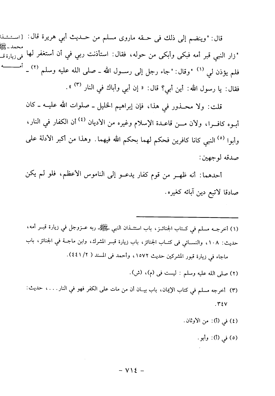(1) أخرجه مسلم في كتاب الجنائز، باب استئذان النبي- صلى الله عليه وسلم- ربه عز وجل في زيارة قبر أمه، حديث: 108، والنسائي فى كتاب الجنائز، باب زيارة قبر المشرك، وابن ماجة في الجنائز، باب ما جاء في زيارة قبور المشركين حديث 1572، وأحمد فى المسند (2/ 441).