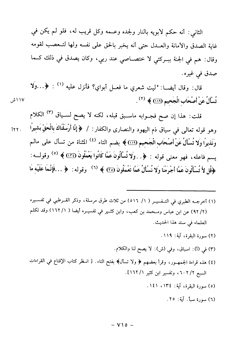 قال: وقال أيضا:" ليت شعري ما فعل أبواي؟ فأنزل عليه «1»: ... ولا تُسْئَلُ عَنْ أَصْحابِ الْجَحِيمِ (119) «2».
