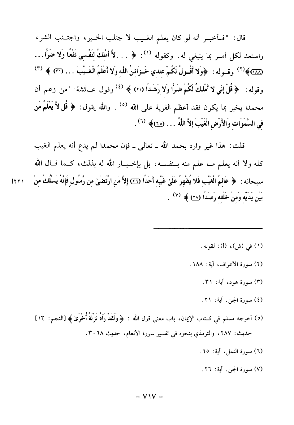 وقوله: قُلْ إِنِّي لا أَمْلِكُ لَكُمْ ضَرًّا ولا رَشَداً (21) «4» وقول عائشة:" من زعم أن محمدا يخبر بما يكون فقد أعظم الفرية على الله «5». والله يقول: قُلْ لا يَعْلَمُ مَنْ فِي السَّماواتِ والْأَرْضِ الْغَيْبَ إِلَّا اللَّهُ ... (65) «6».