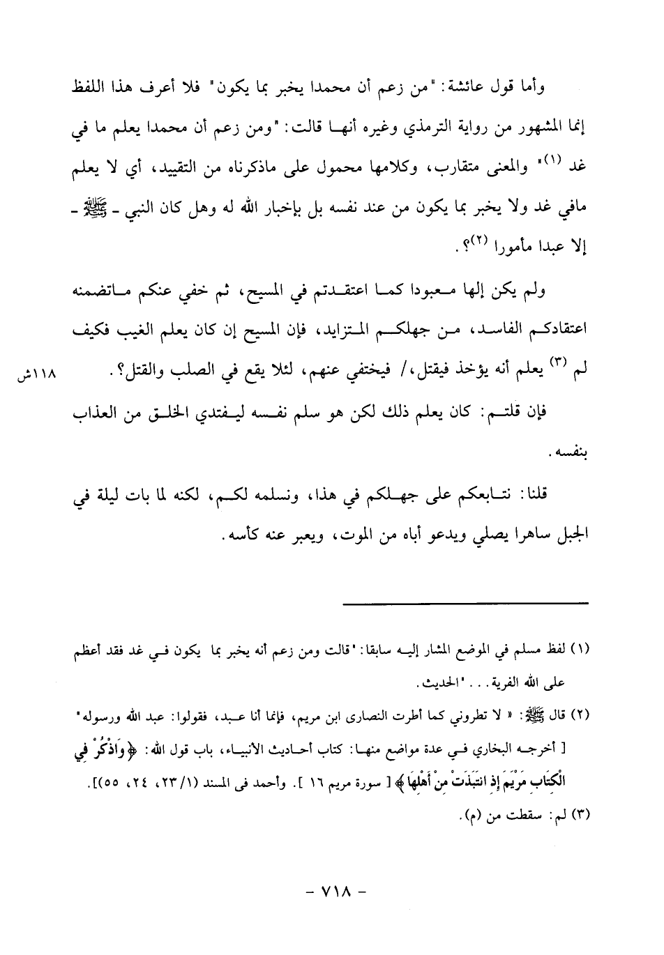 (2) قال صلى الله عليه وسلم: «لا تطروني كما أطرت النصارى ابن مريم، فإنما أنا عبد، فقولوا: عبد الله ورسوله" [أخرجه البخاري في عدة مواضع منها: كتاب أحاديث الأنبياء، باب قول الله: واذْكُرْ فِي الْكِتابِ مَرْيَمَ إِذِ انْتَبَذَتْ مِنْ أَهْلِها [سورة مريم 16]. وأحمد فى المسند (1/ 23، 24، 55)].