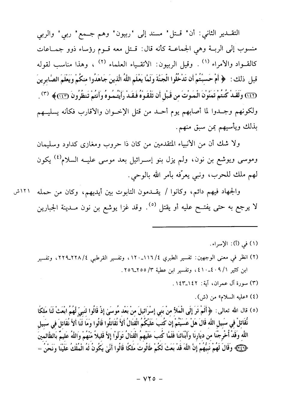 التقدير الثاني: أن" قتل" مسند إلى" ربيون" وهم جمع" ربي" والربي منسوب إلى الربة وهي الجماعة كأنه قال: قتل معه قوم رؤساء ذوو جماعات كالقواد والأمراء «1». وقيل الربيون: الأتقياء العلماء «2»، وهذا مناسب لقوله قبل ذلك: أَمْ حَسِبْتُمْ أَنْ تَدْخُلُوا الْجَنَّةَ ولَمَّا يَعْلَمِ اللَّهُ الَّذِينَ جاهَدُوا مِنْكُمْ ويَعْلَمَ الصَّابِرِينَ (142) ولَقَدْ كُنْتُمْ تَمَنَّوْنَ الْمَوْتَ مِنْ قَبْلِ أَنْ تَلْقَوْهُ فَقَدْ رَأَيْتُمُوهُ وأَنْتُمْ تَنْظُرُونَ (143) «3».