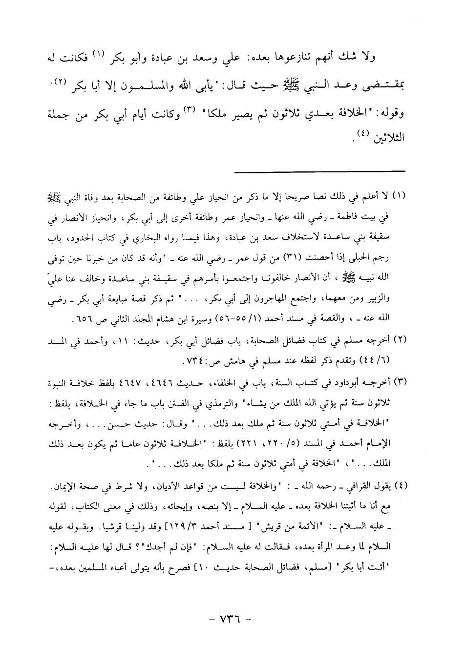 (4) يقول القرافي- رحمه الله-:" والخلافة ليست من قواعد الأديان، ولا شرط في صحة الإيمان.