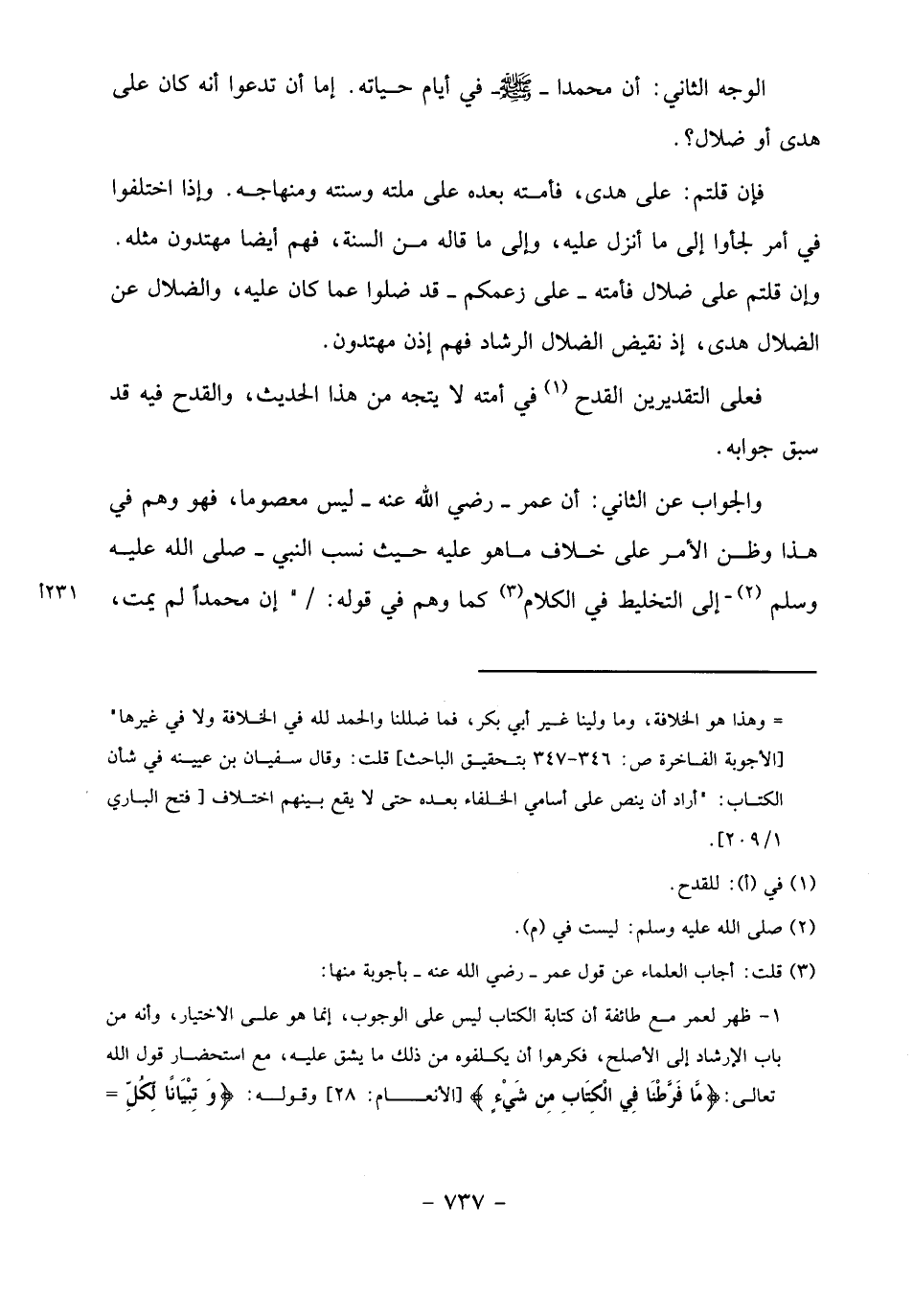 والجواب عن الثاني: أن عمر- رضي الله عنه- ليس معصوما، فهو وهم في هذا وظن الأمر على خلاف ما هو عليه حيث نسب النبي- صلى الله عليه وسلم «2» - إلى التخليط في الكلام «3» كما وهم في قوله:/" إن محمدا لم يمت،