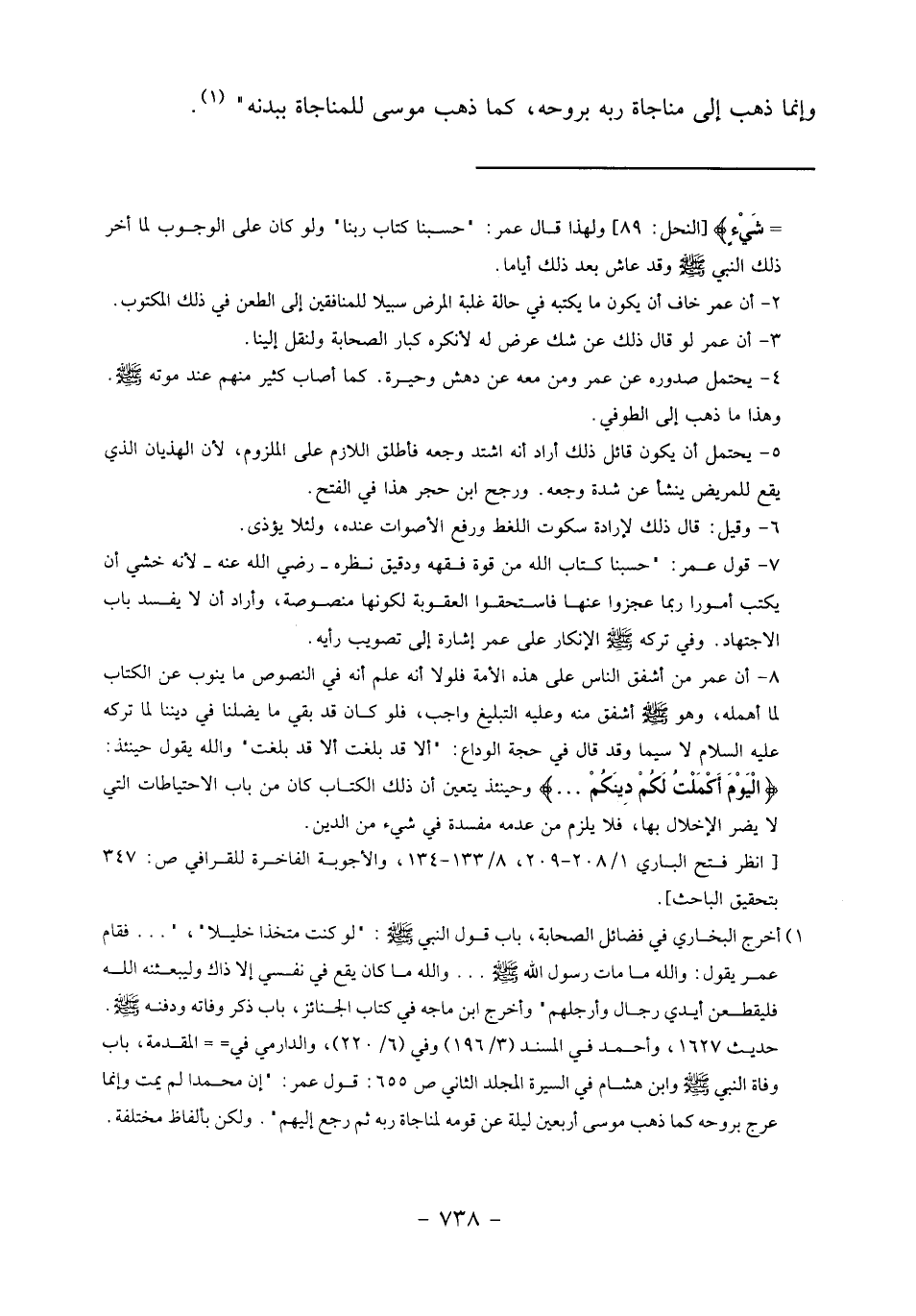 (1) أخرج البخاري في فضائل الصحابة، باب قول النبي صلى الله عليه وسلم:" لو كنت متخذا خليلا"،" ... فقام عمر يقول: والله ما مات رسول الله صلى الله عليه وسلم ... والله ما كان يقع في نفسي إلا ذاك وليبعثنه الله فليقطعن أيدي رجال وأرجلهم" وأخرج ابن ماجه في كتاب الجنائز، باب ذكر وفاته ودفنه صلى الله عليه وسلم.