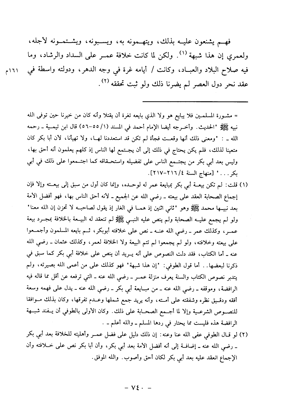 (1) قلت: لم تكن بيعة أبي بكر بمبايعة عمر له لوحده، وإنما كان أول من سبق إلى بيعته وإلا فإن إجماع الصحابة العقد على بيعته- رضي الله عن الجميع- لأنه أحق الناس بها، فهو أفضل الأمة بعد نبيها محمد صلى الله عليه وسلم وهو" ثاني اثنين إذ هما في الغار إذ يقول لصاحبه لا تحزن إن الله معنا" ولو لم يجمع عليه الصحابة ولم ينص عليه النبي صلى الله عليه وسلم لم تنعقد له البيعة بالخلافة بمجرد بيعة عمر، وكذلك عمر- رضي الله عنه- نص على خلافته أبو بكر، ثم بايعه المسلمون وأجمعوا على بيعته وخلافته، ولو لم يجمعوا لم تتم البيعة ولا الخلافة لعمر، وكذلك عثمان- رضي الله عنه- أما الكتاب، فقد دلت النصوص على أنه يريد أن ينص على خلافة أبي بكر كما سبق في ذكرنا لبعضها ... أما قول الطوفي:" إن هذا شبهة" فهو كذلك على من أعمى الله بصيرته، ولم يتدبر نصوص الكتاب والسنة يعرف منزلة عمر- رضي الله عنه- التي ترفعه عن أقل مما قاله فيه الرافضة، وموقفه- رضي الله عنه- من مبايعة أبي بكر- رضي الله عنه- يدل على فهمه وسعة أفقه ودقيق نظره وشفقته على أمته، وأنه يريد جمع شملها وعدم تفرقها، وكان بذلك موافقا للنصوص الشرعية وإلا لما أجمع الصحابة على ذلك. وكان الأولى بالطوفي أن يفند شبهة الرافضة هذه فليست مما يحتار في ردها المسلم- والله أعلم-.
