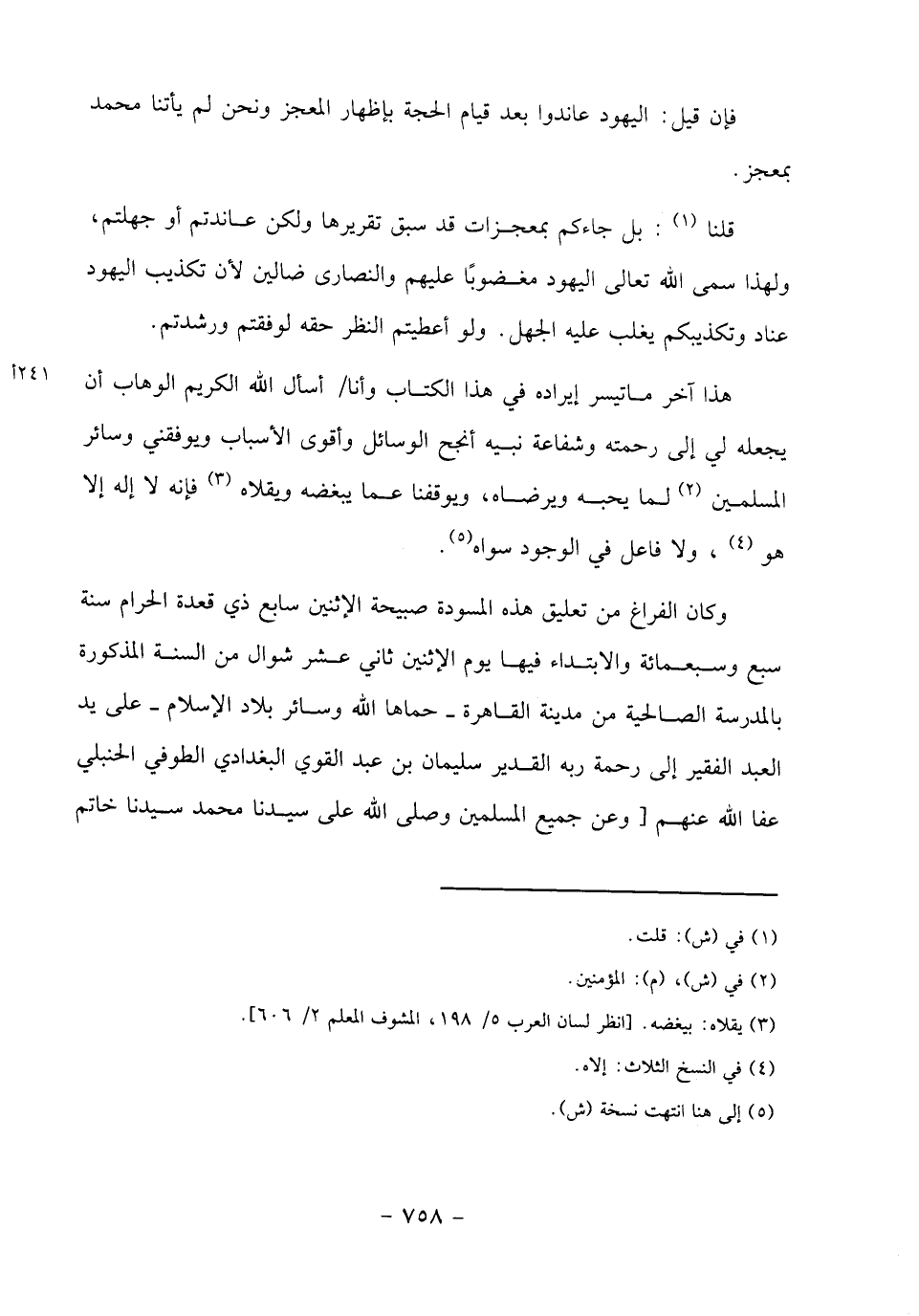 وكان الفراغ من تعليق هذه المسودة صبيحة الاثنين سابع ذي قعدة الحرام سنة سبع وسبعمائة والابتداء فيها يوم الاثنين ثاني عشر شوال من السنة المذكورة بالمدرسة الصالحية من مدينة القاهرة- حماها الله وسائر بلاد الإسلام- على يد العبد الفقير إلى رحمة ربه القدير سليمان بن عبد القوي البغدادي الطوفي الحنبلي عفا الله عنهم [وعن جميع المسلمين وصلى الله على سيدنا محمد سيدنا خاتم