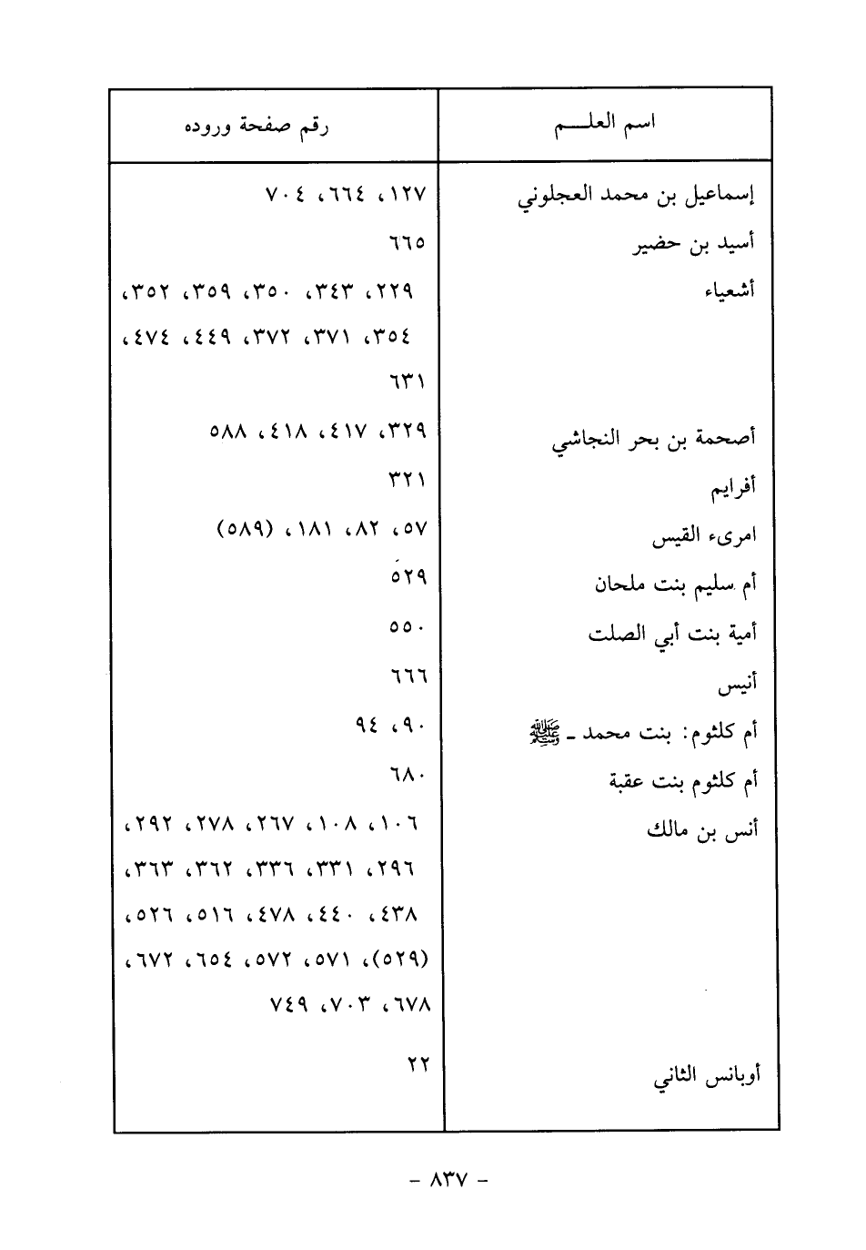 أنس بن مالك 106، 108، 267، 278، 292، 296، 331، 336، 362، 363، 438، 440، 478، 516، 526، (529)، 571، 572، 654، 672، 678، 703، 749