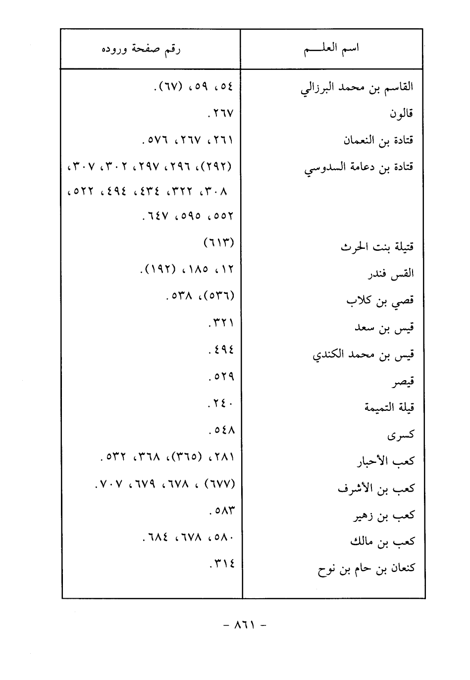 قتادة بن دعامة السدوسي (292)، 296، 297، 302، 307، 308، 322، 434، 494، 522، 552، 595، 647.