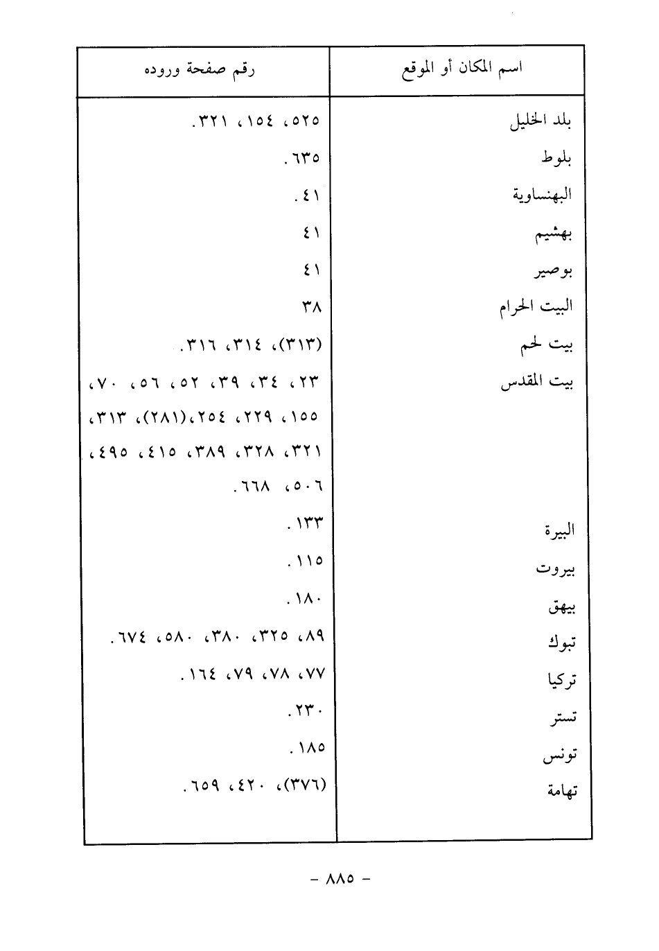 بيت المقدس 23، 34، 39، 52، 56، 70، 155، 229، 254، (281)، 313، 321، 328، 389، 415، 495، 506، 668.
